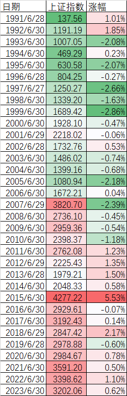 上证指数33年来6月最后一个交易日,16年上涨17年下跌,平均涨幅-0.05%,中位数-0.06%。但从2011年以来13年里只有2019年的6月最后一个交易日上证指数跌了0.60%,其他12年全部上涨。13年来6月最后一个交易日平均上涨1.14%,上涨的概率还是比较大的。但愿明天能让我们回口血: