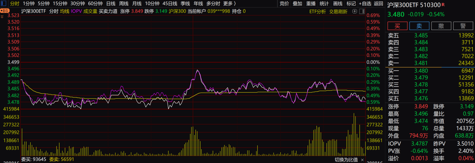 今天市场全面下跌,成交额进一步缩小,上证指数、沪深300指数等主流指数都收盘在几乎今天的最低点,即使这样,还是在官军的大力托盘下的结果,我们看一下成交额最大的沪深300ETF(510300)今天的盘面: