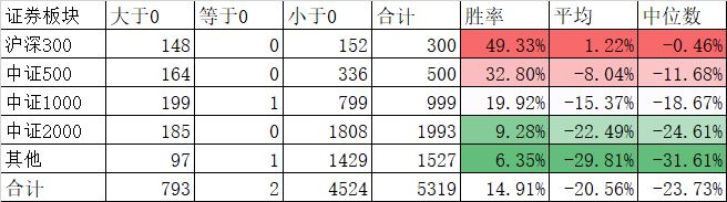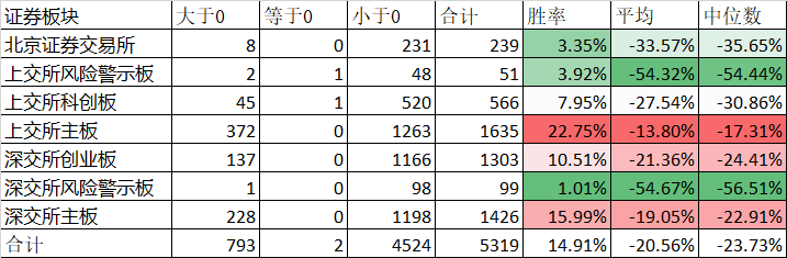 如果剔除风险警示板,那么最差的北交所是最差了,胜率只有3.35%,平均下跌了33.57%,中位数下跌了35.65%,胜率甚至还低于上交所的风险警示板。
