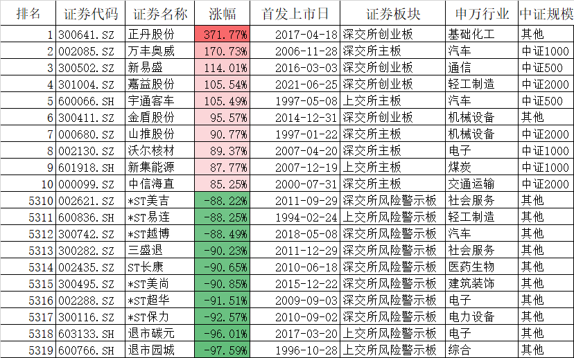 前10中深交所主板4个、深交所创业板4个、上交所主板2个,没有科创板,集中在深交所。规模指数中中证500有2个,中证1000有3个,中证2000有3个,其他有2个,唯独没有沪深300。说明沪深300成分股这样大的股票,很难表现最好,当然也很难表现最差。小票容易占据两头。