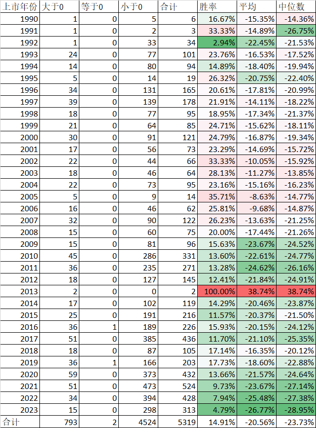 除了1992年的特殊情况外,胜率不到10%的上市年份,竟然就是最近3年:2021年、2022年、2023年,胜率分别为9.73%、7.94%、4.79%,都是上市数量多,质量每况愈下。