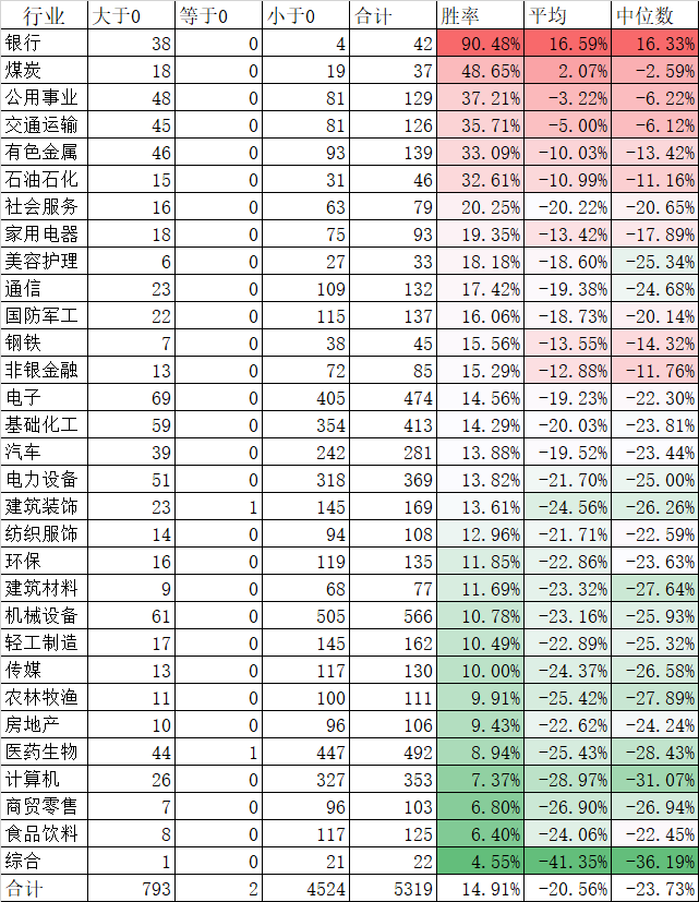 最差的行业为综合、食品饮料、商贸零售、计算机、医药生物、房地产等。都是胜率不超过10%,平均跌幅和中位数超过20%。