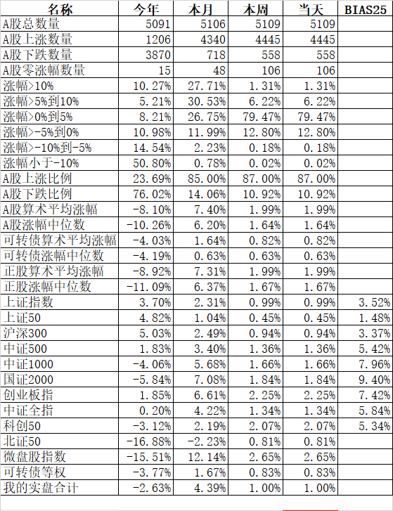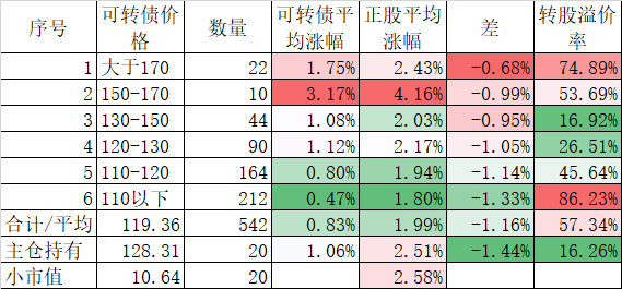 542只可转债平均上涨0.83%,对应正股平均上涨1.99%;我的主仓20只可转债平均上涨1.06%,对应正股平均上涨2.51%。实际账户合计上涨正好1.00%。