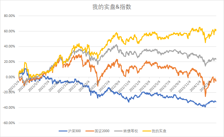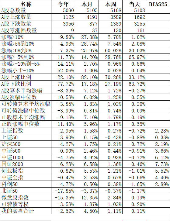 535只可转债平均上涨0.87%,对应正股平均上涨1.16%;我主仓20只可转债平均上涨1.56%,对应正股平均上涨1.84%。可惜我的可转债仓位只有30%,再加上持有的债券ETF又下跌,所以最终账户实际只有上涨了0.27%。我的一个满仓可转债的账户,今天涨了1.60%了,可惜这个小账户的贡献很小。