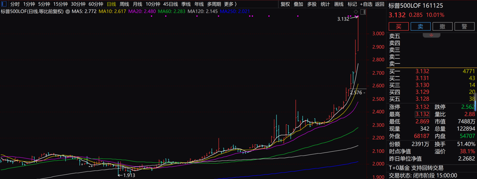 今天无意中看了一眼场内基金的涨幅,发现有个指数LOF竟然涨停了,而且是标普500,代码是161125。昨天晚上标普500指数才上涨了0.56%,前天的基金净值是2.2682,就算增加了0.56%,也只有2.2809,而今天这只基金场内收盘竟然涨停在3.132元,溢价了3.132/2.2809-1=37.31%。要知道,标普500指数从2020年12月31日算起,涨到昨天2024年3月19日,也仅仅只有涨了37.87%,也就是说这个基金的溢价,相当于标普500指数上涨了3年多的涨幅。换句话说,如果3年多前你买了溢价37%多的这只标普500基金,到了今天如果外汇额度充足可以申购的话,这个溢价马上消失,你买了3年多的标普500基金,结果是颗粒无收。当然这里没有考虑汇率等细节。