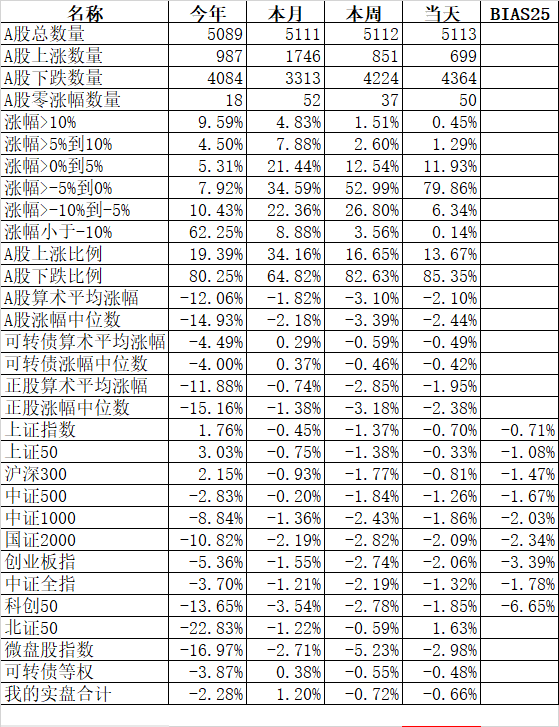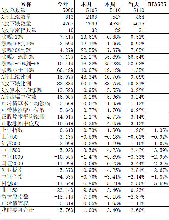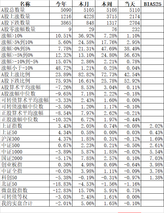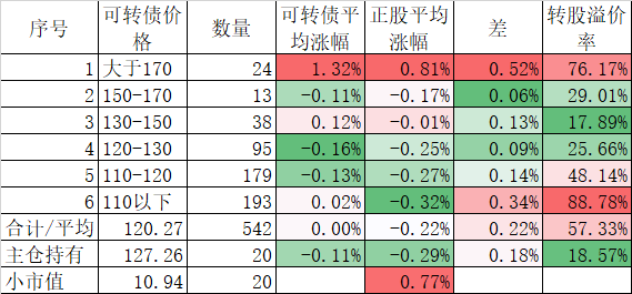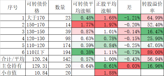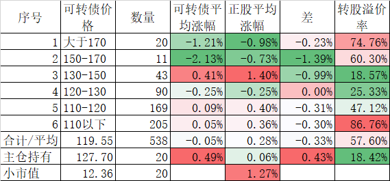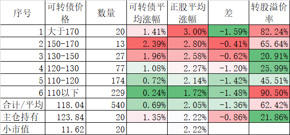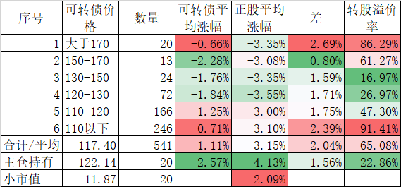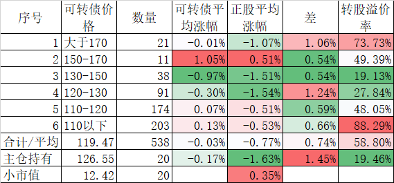 541只可转债平均下跌0.42%,对应正股平均下跌1.60%;我的主仓20只可转债平均下跌0.45%,对应正股平均下跌0.95%,实际账户正好也是下跌了0.45%。