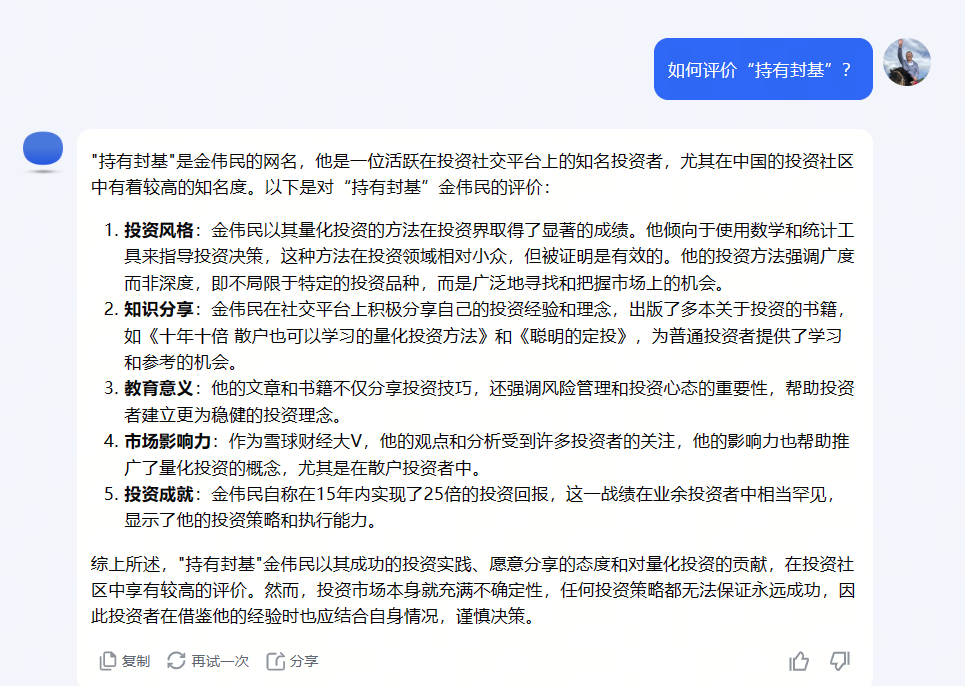 很多AI的平台我们墙内的也无法用,最近国内最激动人心的是kimi的推出,我试用了一下,比过去的几个大公司的平台好很多了,比如我自己查询我的网名“持有封基”,kimi不仅仅是搜索了资料,而且还整理了这样: