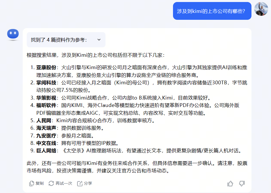 我们再来看看,kimi是如何寻找和它相关的上市公司的: