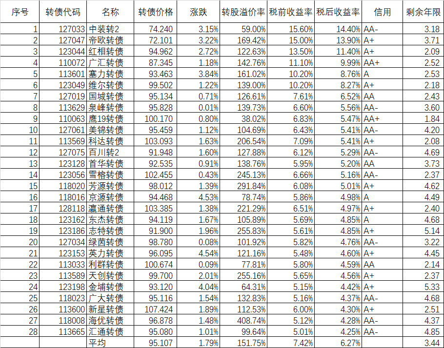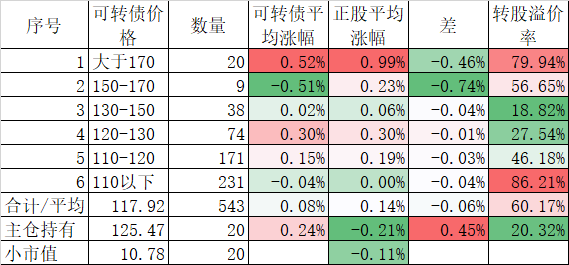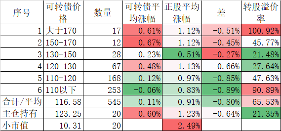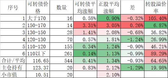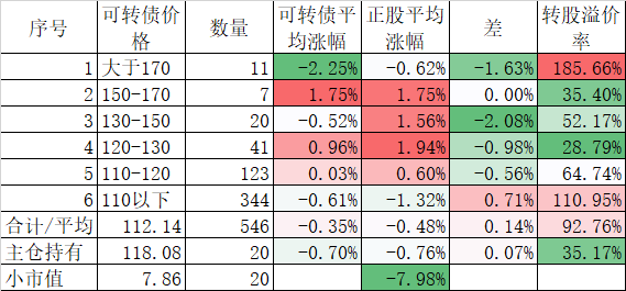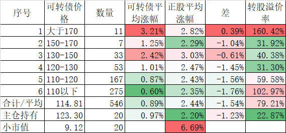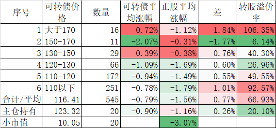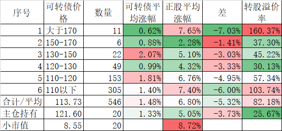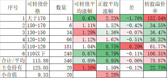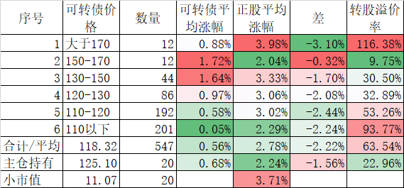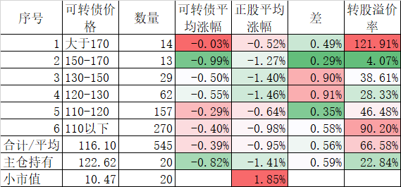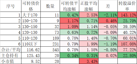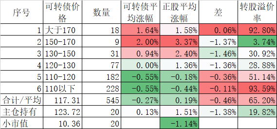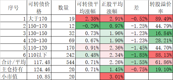 546只可转债平均上涨1.48%,对应正股平均上涨7.40%,可转债涨幅严重跟不上正股涨幅,不过这也正常,前期可转债的强烈的抗跌性使得溢价率上涨了很多,现在市场好了当然要还。当然有本事的能在市场底部切换正股更好,我是没这个能力只会傻傻的满仓轮动。