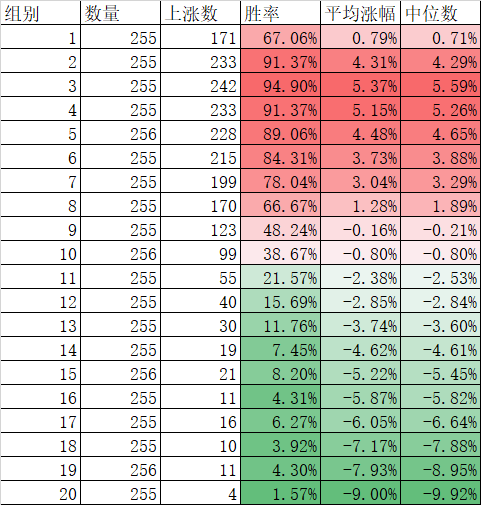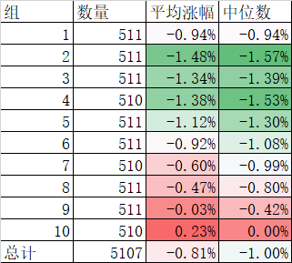 今天涨的最好的中证500基本落在第2、3组,而中证1000基本落在第4-7组,而国证2000基本落在第5-12组,其中9、10、11、12组都是负收益,所以才导致了中证1000和国证2000今天的差异有那么大。当然微盘股大致在最后2组,表现确实是最差的。