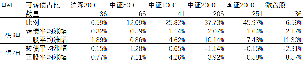 36只对应微盘股的可转债,昨天正股平均跌8.57%,可转债平均跌2.31%;今天正股平均涨11.30%、可转债平均涨2.17%。
