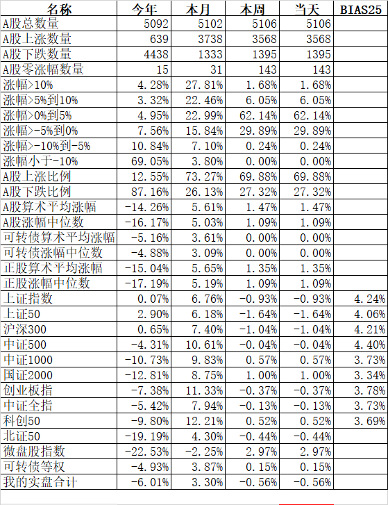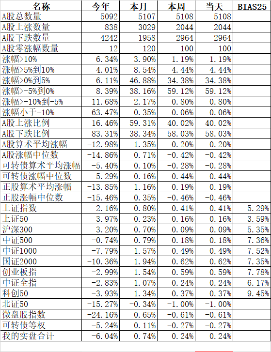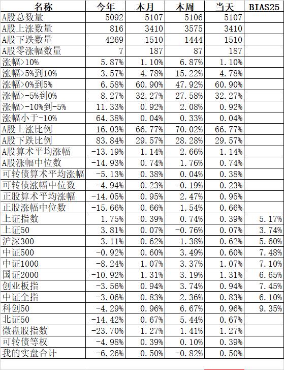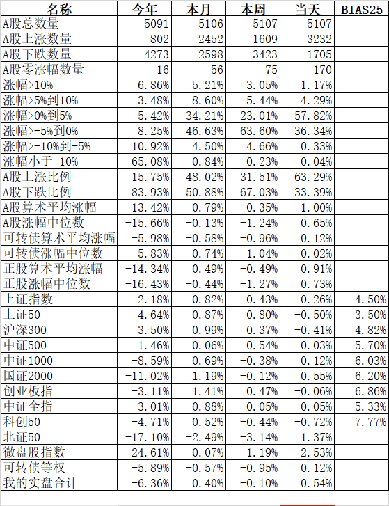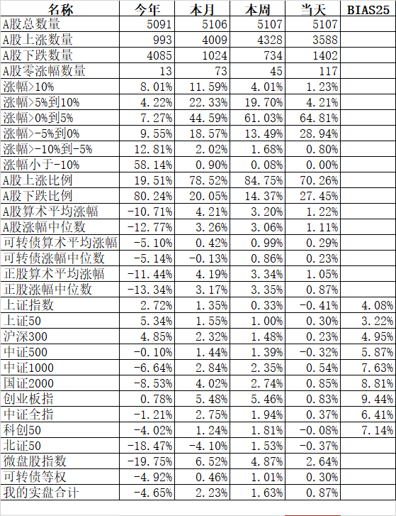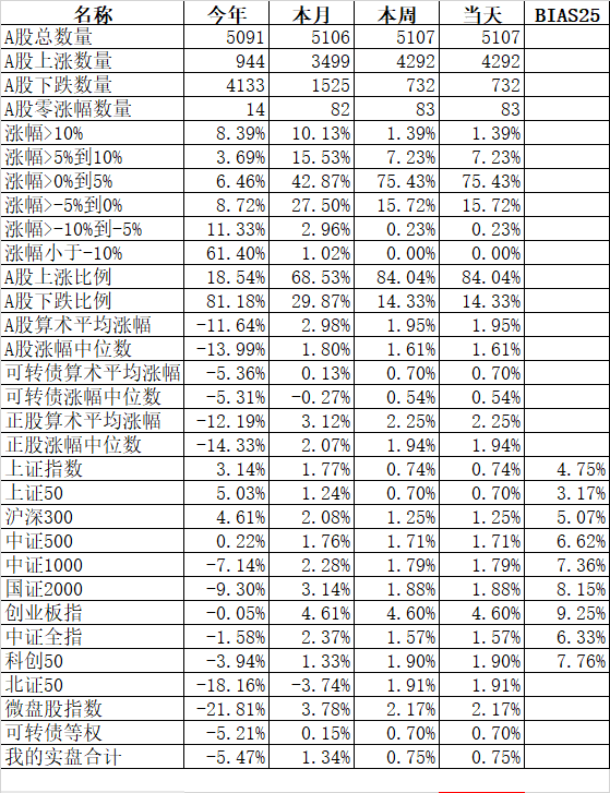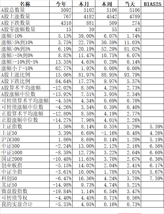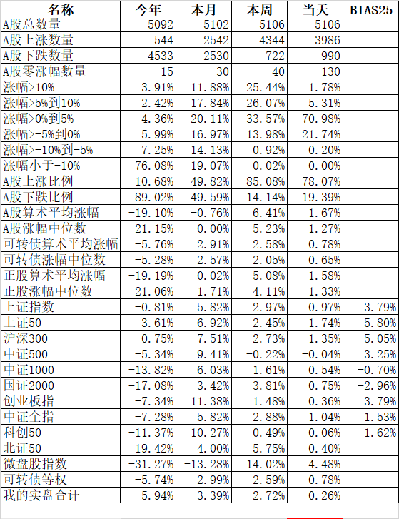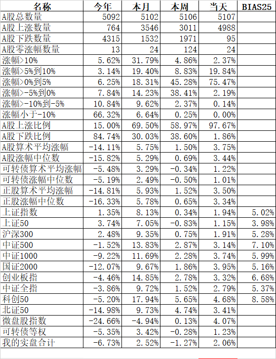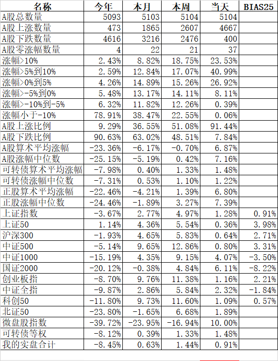 大人孩子一起保!大艾难产,接生医生问:保大人还是保孩子?新领导最新指示:先保大人后保孩子,大人小孩一起保! 主流宽基指数领涨的微盘股指数大涨10.00%、国证2000涨6.11%;殿后的上证50涨0.36%、沪深300涨0.64%。今天的反弹强度完全反过来了,微盘股指数罕见的大涨了10%。申万一级行业指数中领涨的计算机涨5.68%、综合涨5.44%、房地产涨5.03%;唯一下跌的银行跌0.48%...