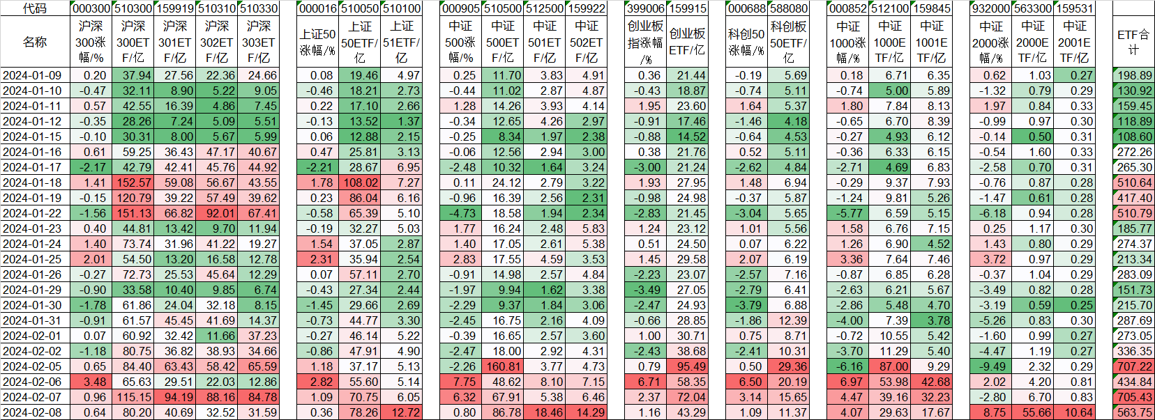 表中把宽基指数的涨幅(%)和相应的ETF成交额(亿)做了对比,从上表看的非常清楚,救市从1月16日沪深300指数开始的:当天的300ETF的510300,成交额从前1天的5.99亿一下子增大到40.67亿,510310从5.67亿增加到41.17亿,159919从8.00亿增加到36.43亿。但这个时候510300反而增加不多,一直到1月17日沪深300大跌2.17%后,第二天510300一下子从42.79亿增加到152.57亿,成为成交额最大的300ETF,当天沪深300指数大涨了1.41%。