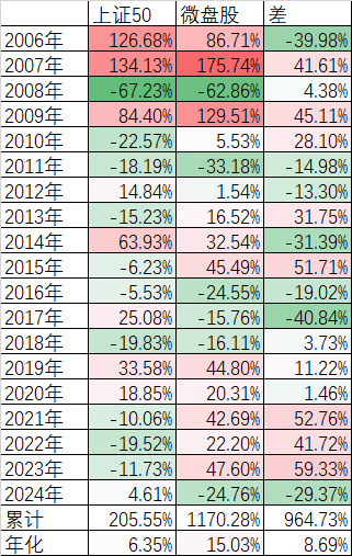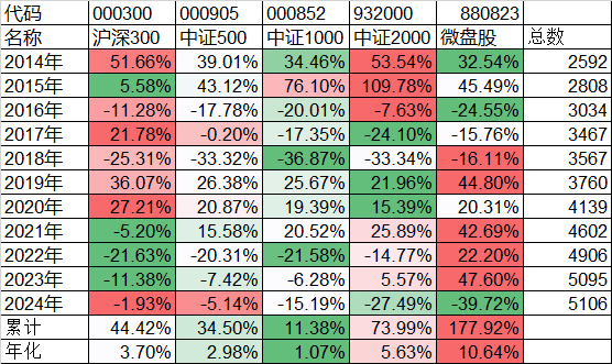 我们先看看这10多年来从规模最大的沪深300指数到最小的微盘股指数的涨跌的情况。长期来看,还是规模越小的指数,收益率越大。