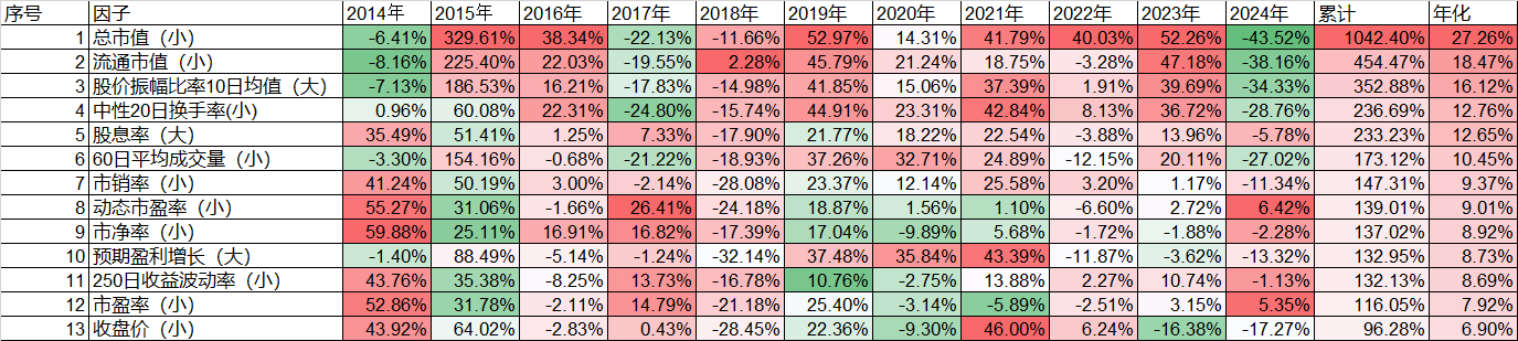 我们再看看果仁网上38个因子在这10年多来年化收益率超过4%的13个因子的表现(条件:5个交易日轮动一次,平均持有50只股票,交易成本千分之二)。长期表现比较好的前4个因子,今年1个多月都跌了28%以上。今年正收益率的两个市盈率因子,2022年也都是亏损的。而今年比较好的双因子(低波红利),其单因子今年也是亏损的(-5.78%、-1.13%),只不过跌幅相对比较小。而这10年最惨38.16%、的2018年,这13个因子中12个都是亏损的,唯独正收益率的流通市值因子,虽然在2018年涨了2.28%,但2024年跌了38.16%,2017年跌了19.55%。