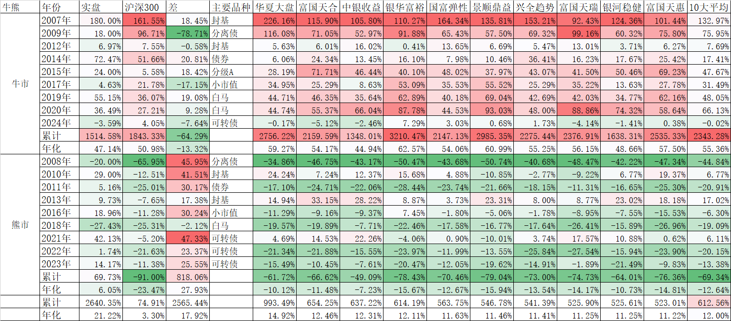 9年熊市,我的主仓都是封基、分离债、债券、可转债等熊市有优势的品种,除了2018年选错了满仓白马跑输指数外,其他年份大部分还都是正收益,即使在历史上最大的熊市年——2008年,也只亏损了20%,比起沪深300指数下跌65.95%和华夏大盘下跌34.86%,已经算是跌幅非常小了,要知道,这一年华夏大盘下跌34.86%,已经是公募基金里跌幅最小的了。