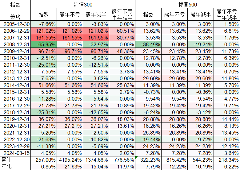 有人会说熊市不亏太难了,那么我们假定熊市亏损打对折,那么沪深300指数的年化从6.85%提高到15.04%,而标普500从7.79%提高到10.19%,还是沪深300指数战胜了标普500。