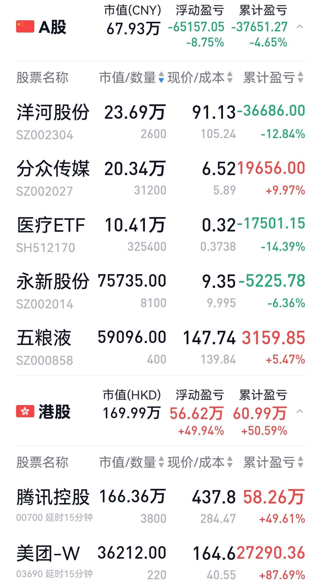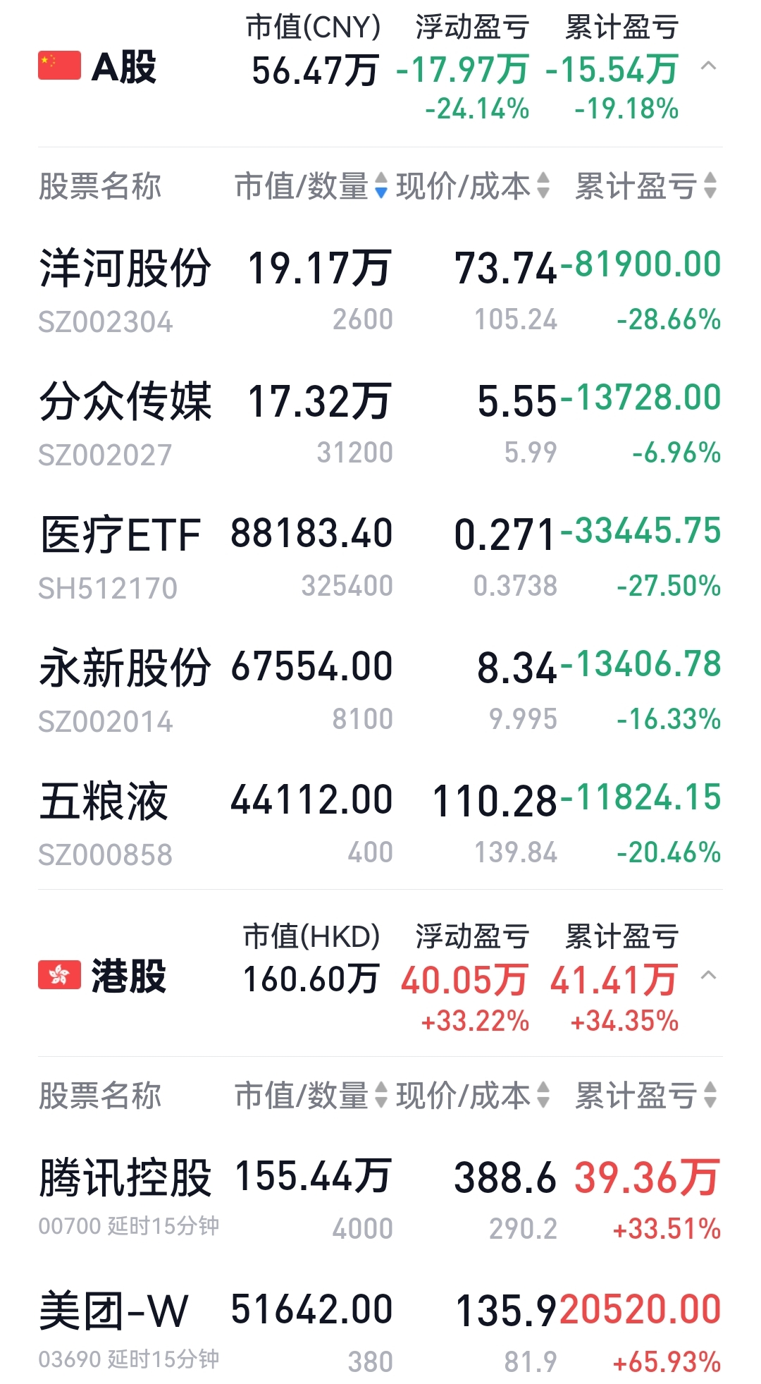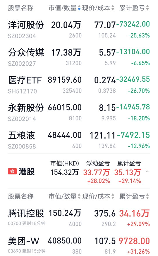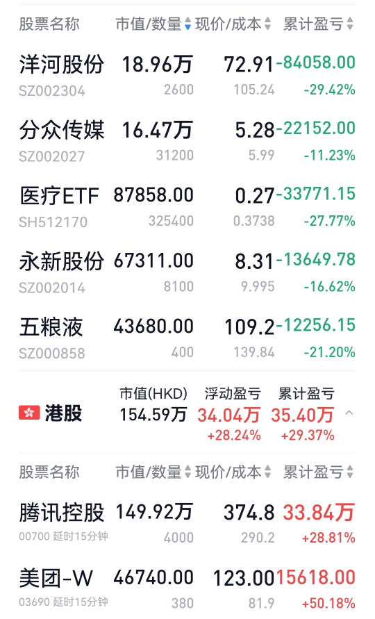 洋河、五粮、分众和医疗分别创了今年的新低。可见A股今年跌的挺惨的。个人A股持仓今年跌去了13个,幸亏重仓腾讯,大A只占30%,但还是跌的肉痛啊。医疗和五粮都到了加仓位,但最近花销较大,没攒下钱,否则会加。4个创了今年新低的,五粮和医疗可加,分众和洋河仓位已高,不动。永新如果下跌,创新低亦可加。