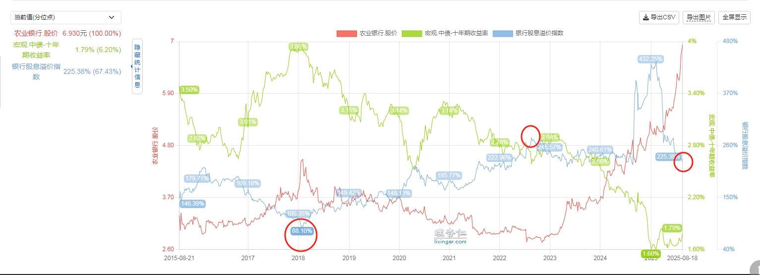 我偏重宏观决策,并且主要以融资持有银行ETF,思路可能大部分人不一样真的是殊途同归,我判断银行股是否高估的方式其实跟你差不多,也是偏宏观的指标,但是是用:五大行的A股平均股息率/十年期国债收益率的比值。