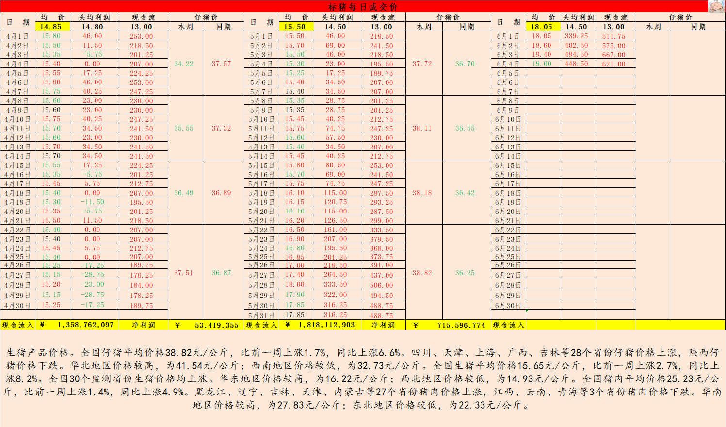随着天气生升,大猪的出栏速度在加快,然后就是降重,预计5月初之前猪价不会有太大起色,5月中旬如果南方非瘟严重,不排除短期内再砸个大坑,然后出现20多元的高猪价。