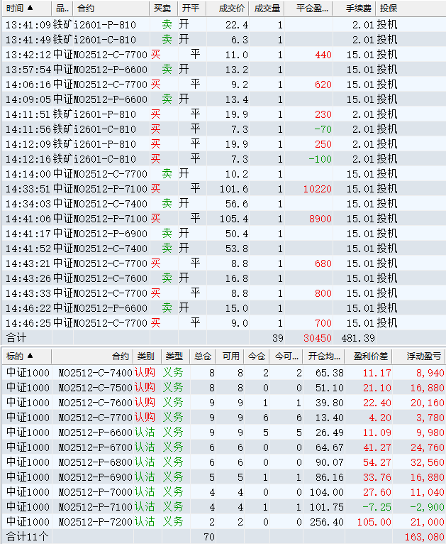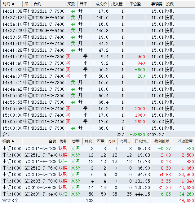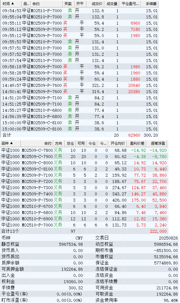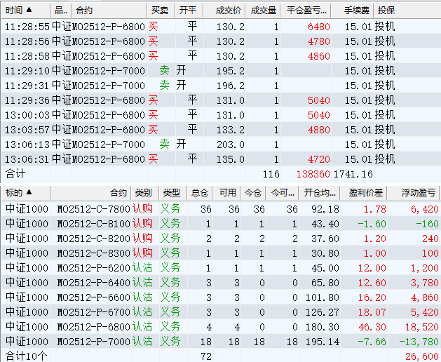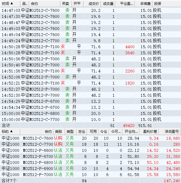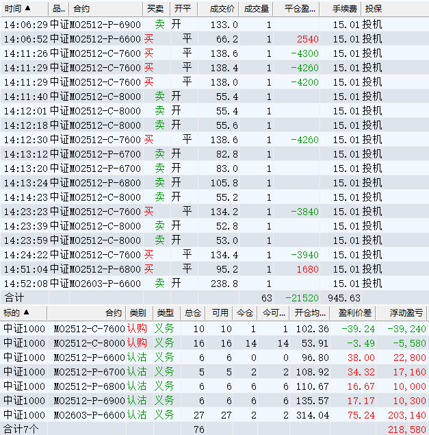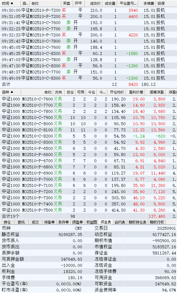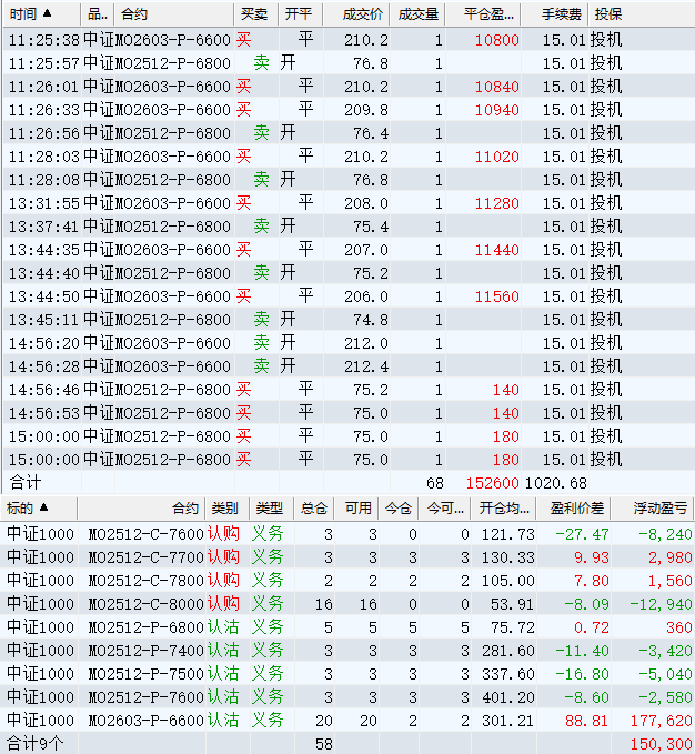 日盈利额=(147240.80逐笔浮盈) + (49420.00平仓盈亏) - (915.61手续费) - (154080.90昨天逐浮盈) = 41664.29日收益 = 0.99%周收益 = 6.29%年收益 = 37.51%年超额中证1000 = 14.41%MO2512超额中证1000 = 2.52%年内最大回撤 = -52.21%最新回撤 = -1.81%Delta合计 = -4.24...