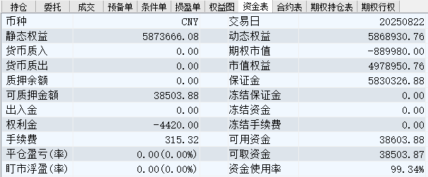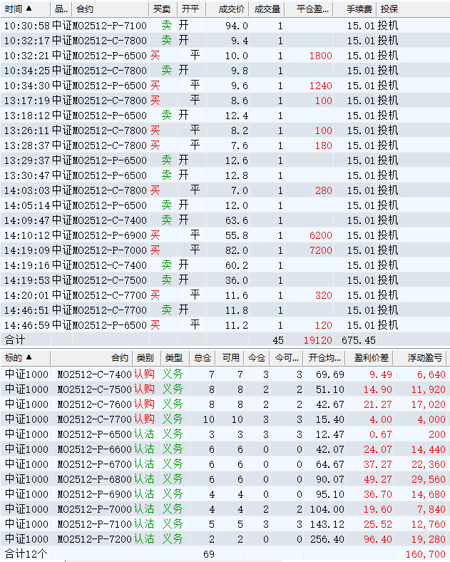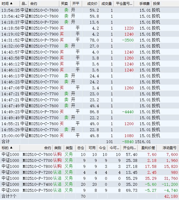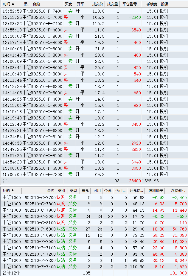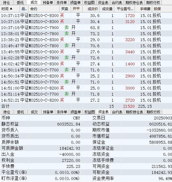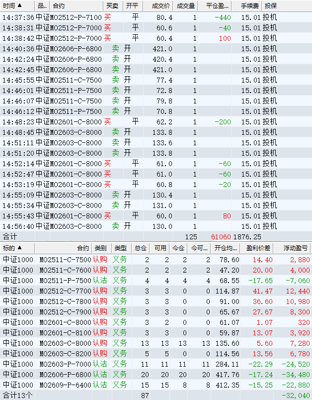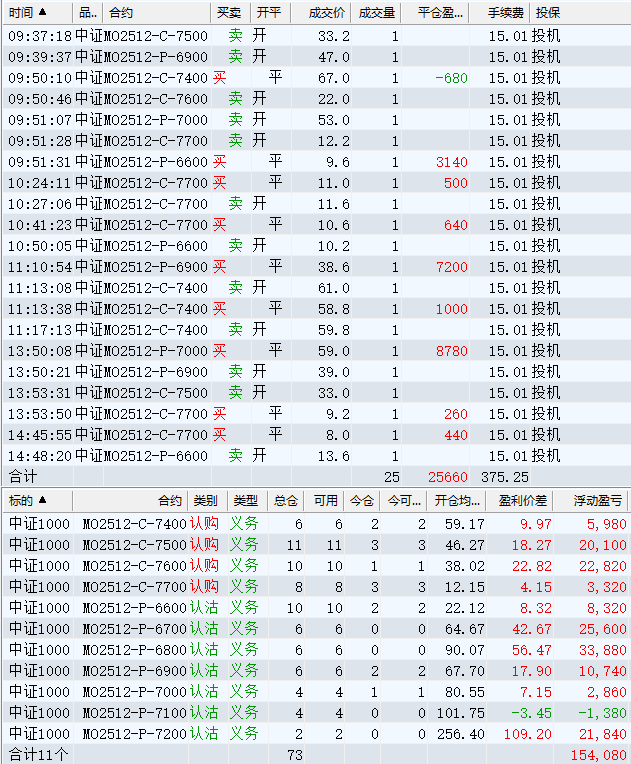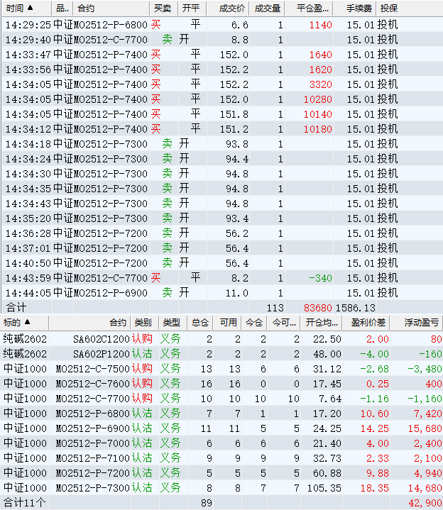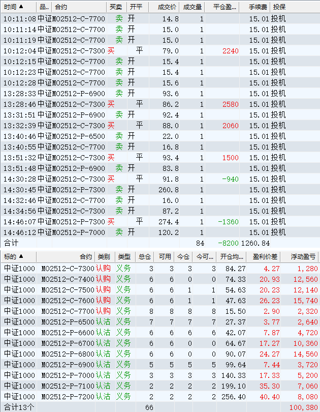 日盈利额=(147240.80逐笔浮盈) + (49420.00平仓盈亏) - (915.61手续费) - (154080.90昨天逐浮盈) = 41664.29日收益 = 0.99%周收益 = 6.29%年收益 = 37.51%年超额中证1000 = 14.41%MO2512超额中证1000 = 2.52%年内最大回撤 = -52.21%最新回撤 = -1.81%Delta合计 = -4.24...