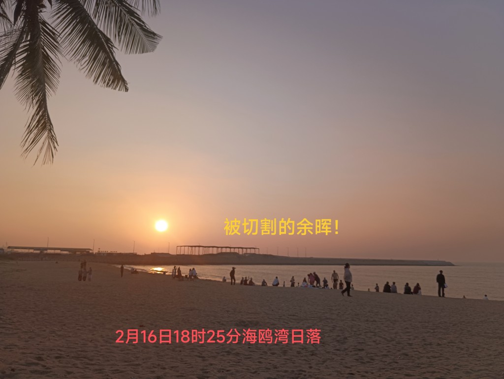 太阳一寸一寸地降落,夕阳很美!可是眼前长长的人工海堤破坏了落日的余晖!海天被无聊的割裂,很不协调!