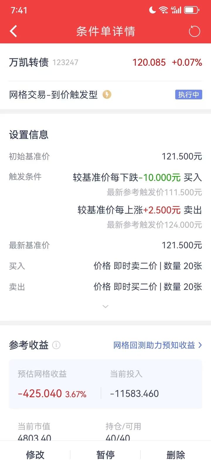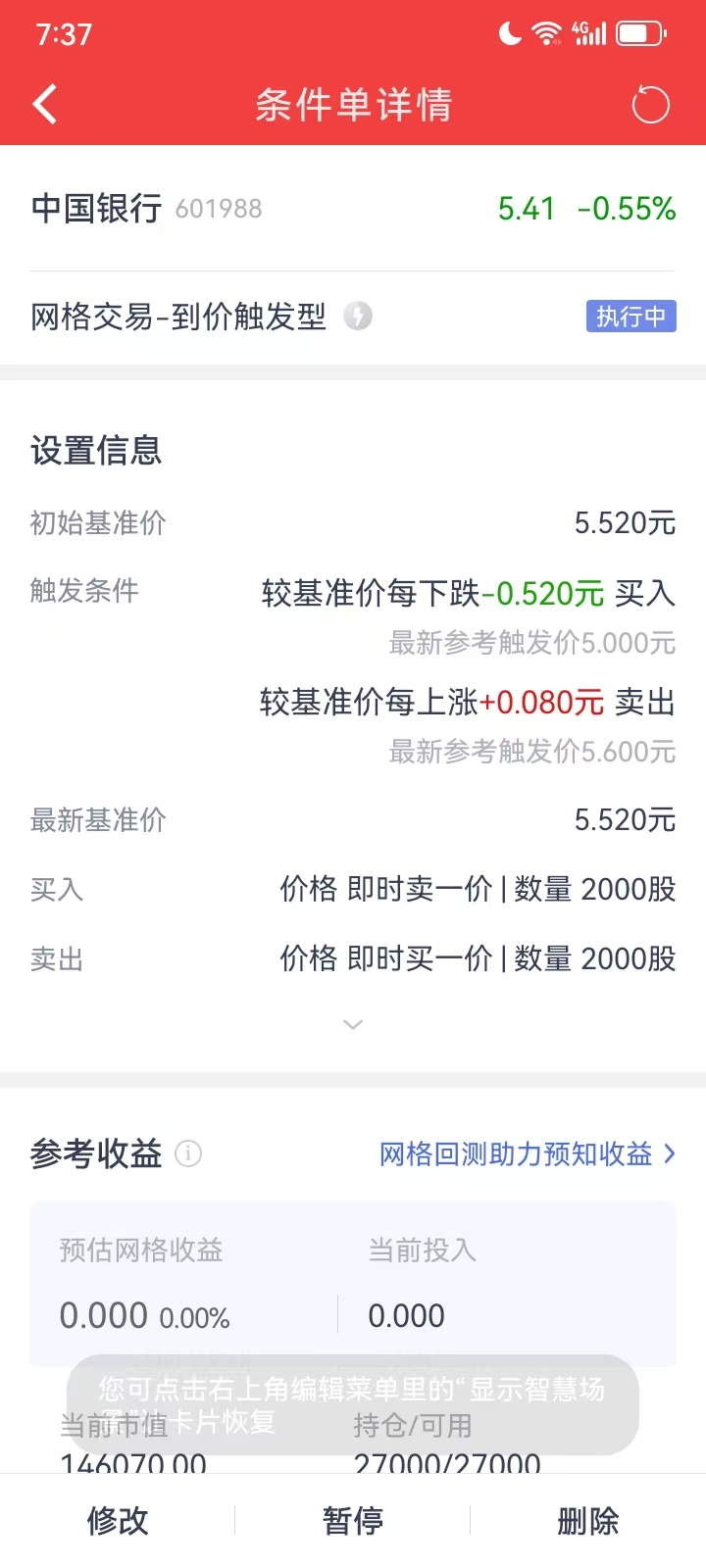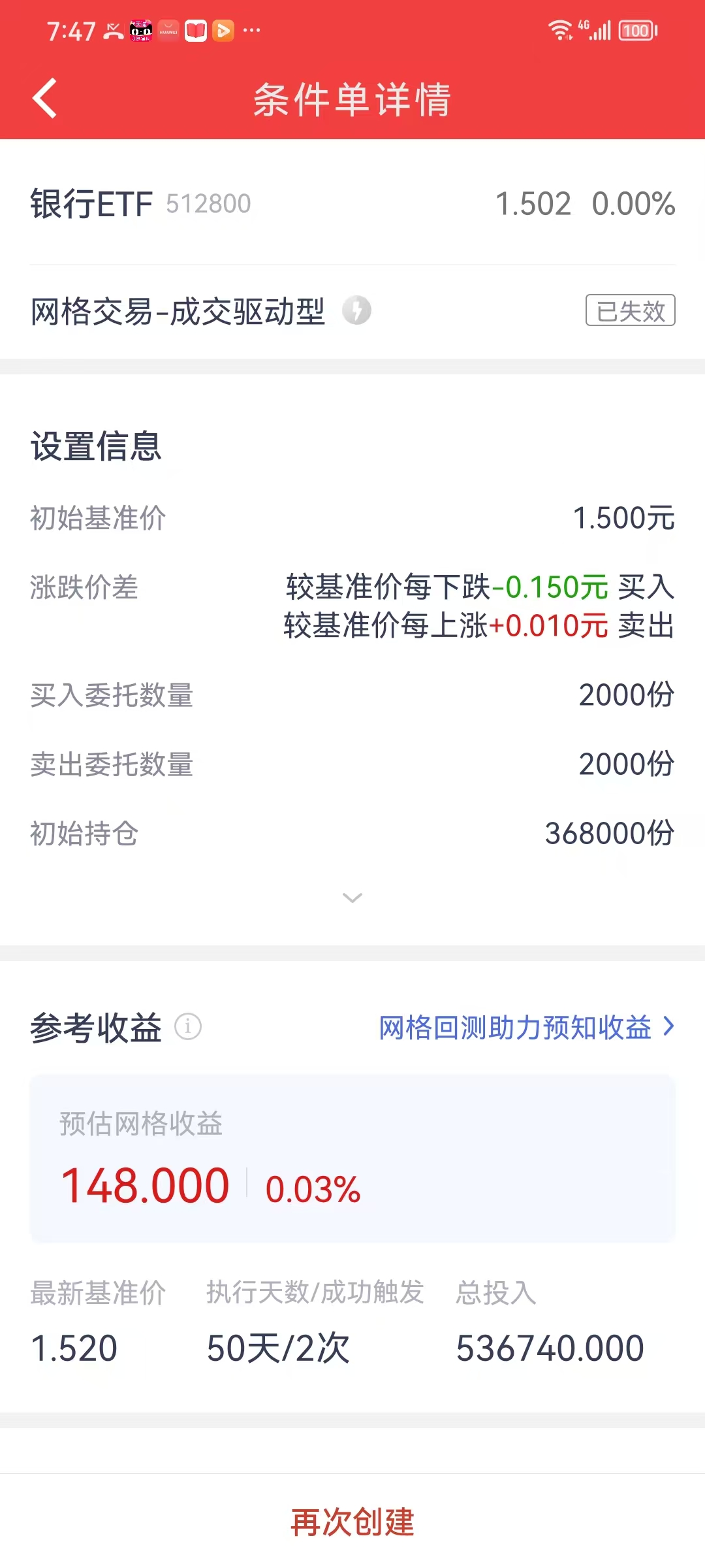 我是一个七十多岁的老人,证券交易主要靠智能条件单自动成交。我在银河证券的一个账户设置的条件单,大多数是网格交易,也又一些定价卖出和定价买入等。两年多来个人感觉还不错,发个成交记录的帖子,希望得到集友的帮助和指教。成交记录绝大多数是智能条件单自动成交,也会有少数是手动委托成交的。帖子的标题就改为智能条件单的成交记录吧。有成交时争取每天发贴,如果万一成交笔数较多,就至少发一个成交标的完整记录,优先发512800银行ETF的成交记录。因为512800银行ETF的持仓市值约占这个账户的百分之四十,另外这个帖子最初的标题是512800银行ETF的网格交易,而且自2024年2月5日发贴以来的大多数回复都是512800银行ETF的成交记录。