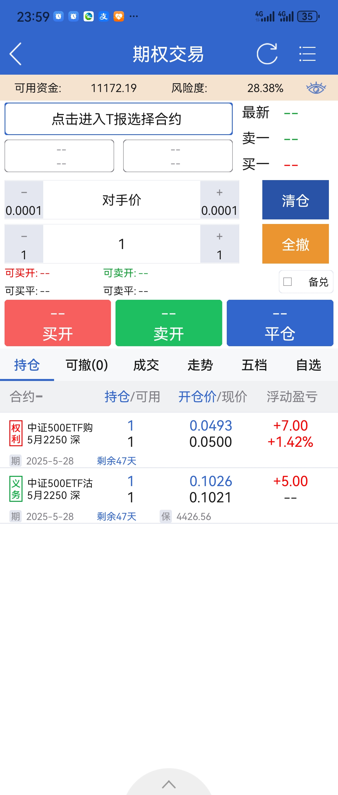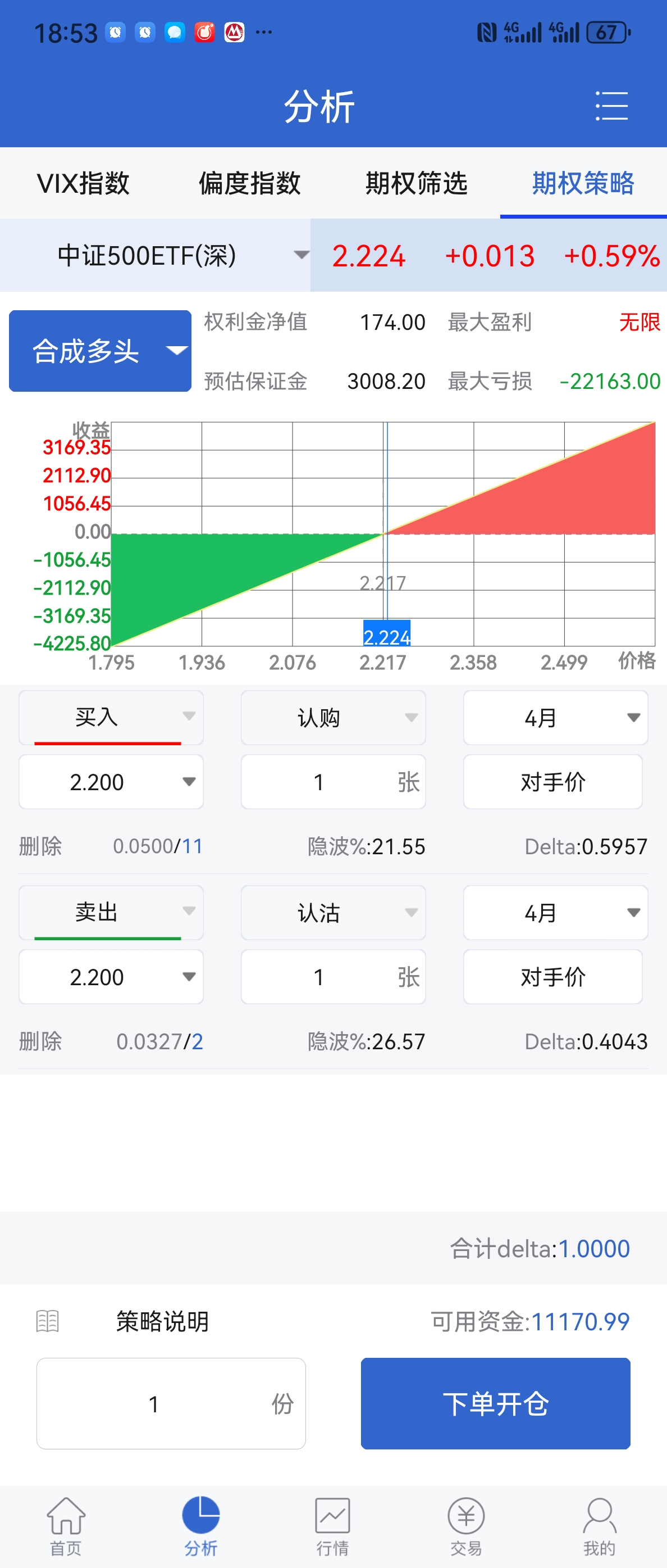 后面还是因为资金不足的原因,没有下定决心操作IM吃贴水,做了一下模拟盘。近期经过一些期权策略的研究,发现利用期权策略合成看多500ETF,也可以获得类似贴水的效果。一手深市500ETF合约市值22000左右,对普通散户比较友好。同时满足贴水和杠杆。本人投入本金15000,实盘尝试一下,定期更新。当前