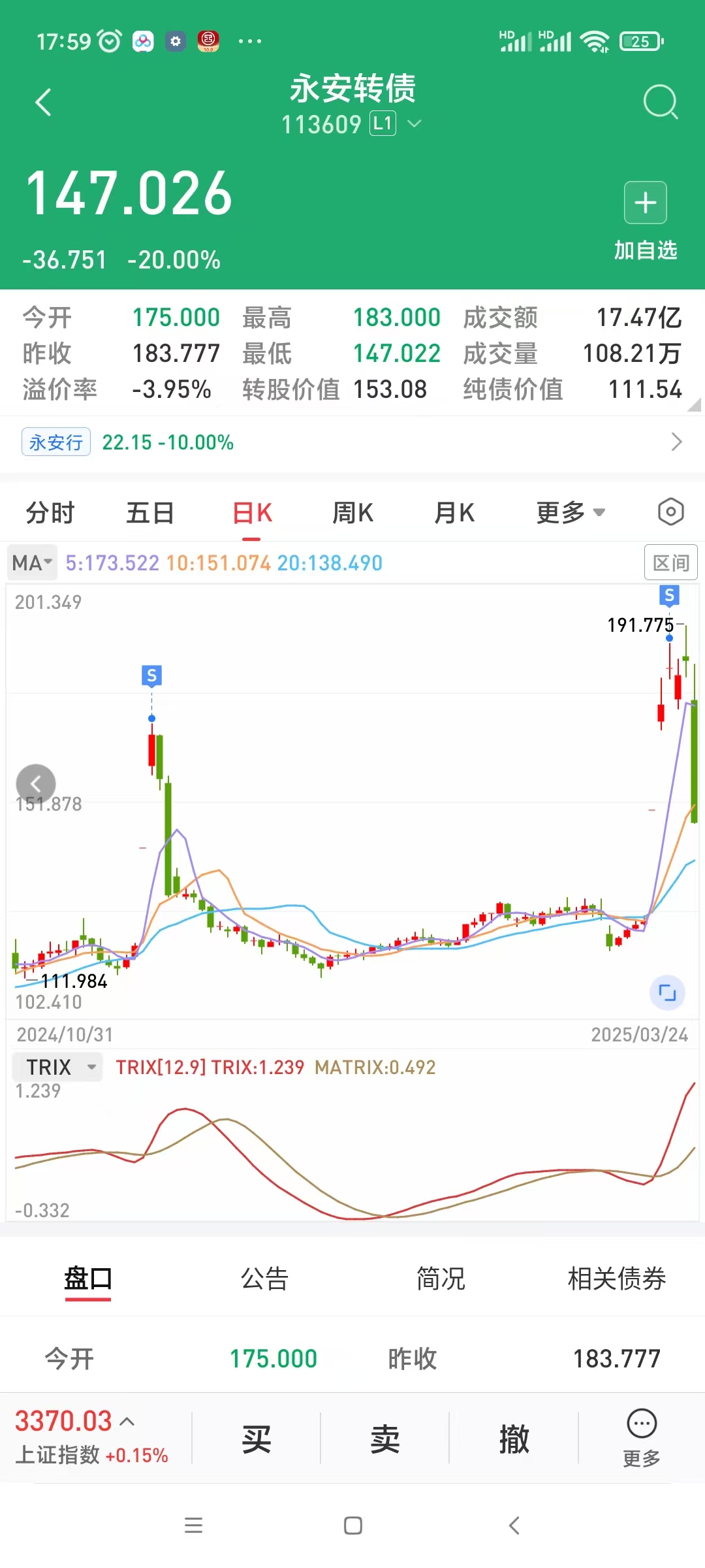 关于广汇转债,没什么可以说的,你要他的利息他要你的本金,从21年90买100张,涨到100多卖了一半,今年到6月,陆续加到几百张,最低43买了100张,后面T来T去,到周五A账户这个票还亏了几百,感觉面退可能比较大,最后A账户清仓,留下B账户的20张看底牌,昨天没有心思操作,等反应过来时,已经晚了,又多亏了 1千多(计提90%)。现在债底的锅打破了,还是要多小心!!可转债也不是只有鬼故事。。还有真...