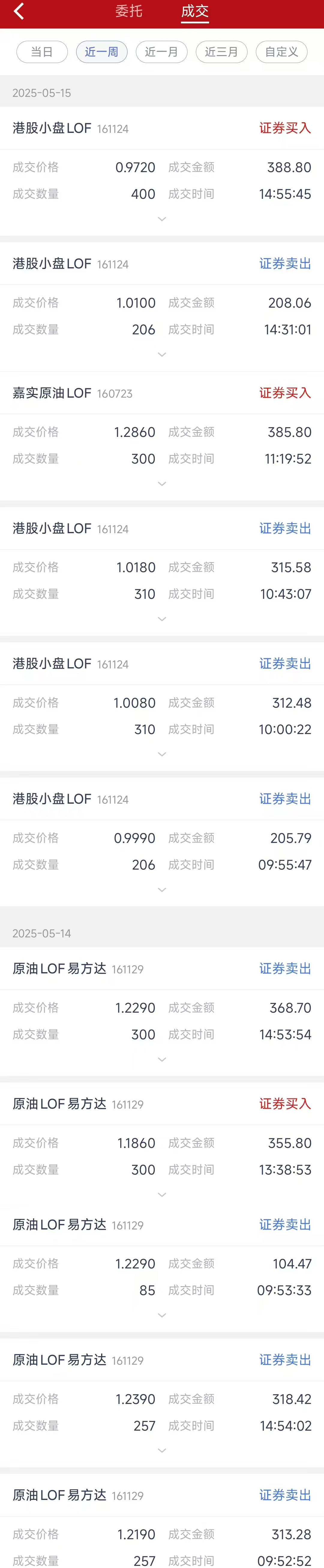 161116,161129 昨晚到账,算了一下跌停卖,100元只能赚不到1元钱,感觉太卷了,算了不委托了,今天看怎么操作。果然开盘既然没有怎么跌,我只有两个账户10个号,一路开卖,现在看都是卖在高点。不知道剩下的时间怎么走。继续申购1000元。10个账户能赚100元确实不错。哎,如果有十个账户,100个号就好了。还是亲戚朋友太少(也是自己套利还不成熟,先自己做,再去找账号吧)