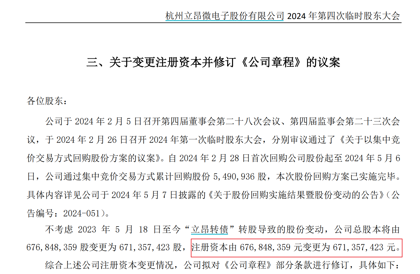 立昂微今天召开2024年第四次临时股东大会,其中一个议案是变更公司注册资本,注册资本由 676,848,359 元变更为 671,357,423 元。如果通过,是不是要触发减资清偿了?转债规模30亿,显然拿不出这些钱,估计会给申报设障碍