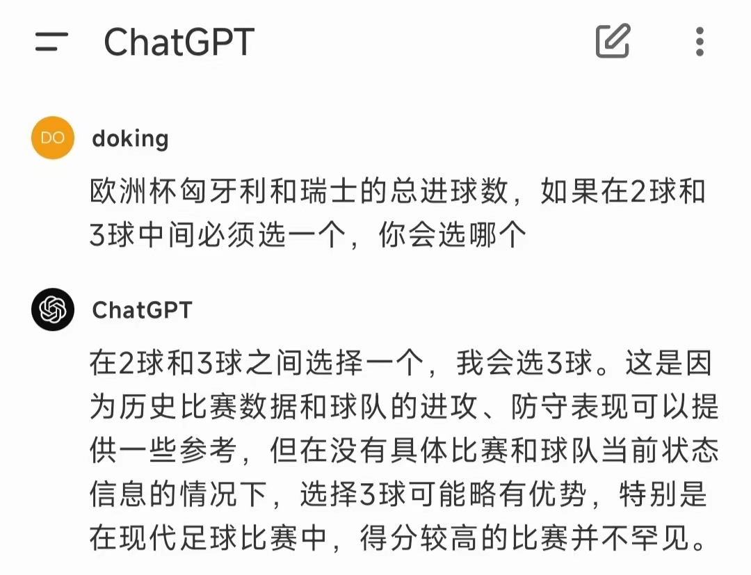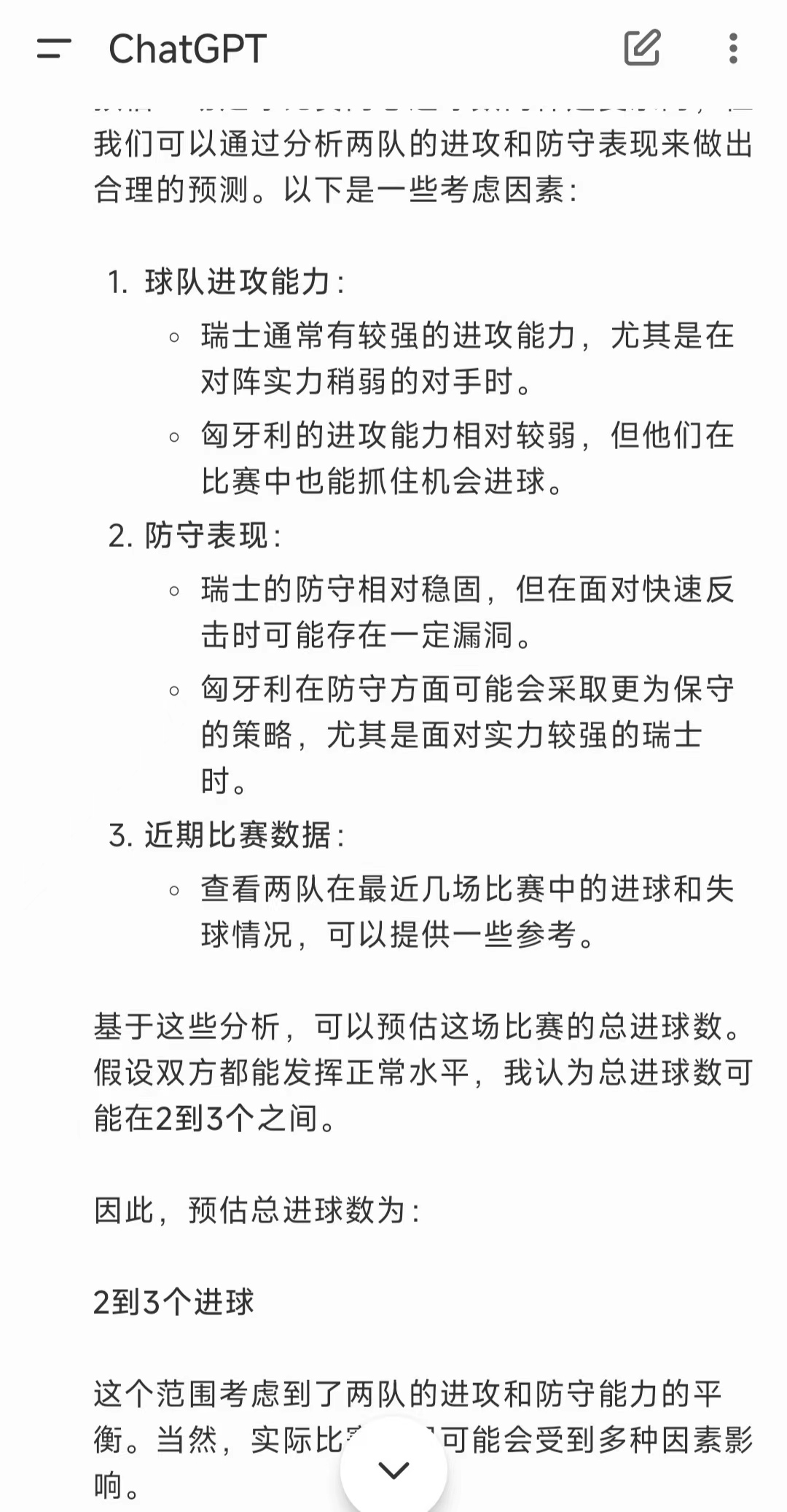 赛只有胜平负(单关),比分,总进球数,半全场4种玩法,因比分和总进球数存在冲突,根据预测只采用总进球数玩法,每种玩法让ChatGPT预测结果。根据模型,综合各种因素后选择概率最大结果。