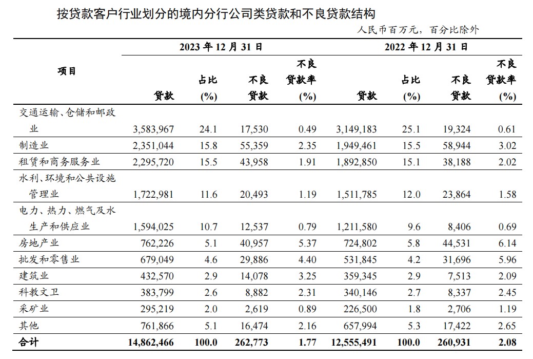 2023年末,工商银行境内公司类贷款不良率1.77%,不良率前三名行业分别是房地产业5.37%、批发和零售业4.40%、建筑业3.25%。