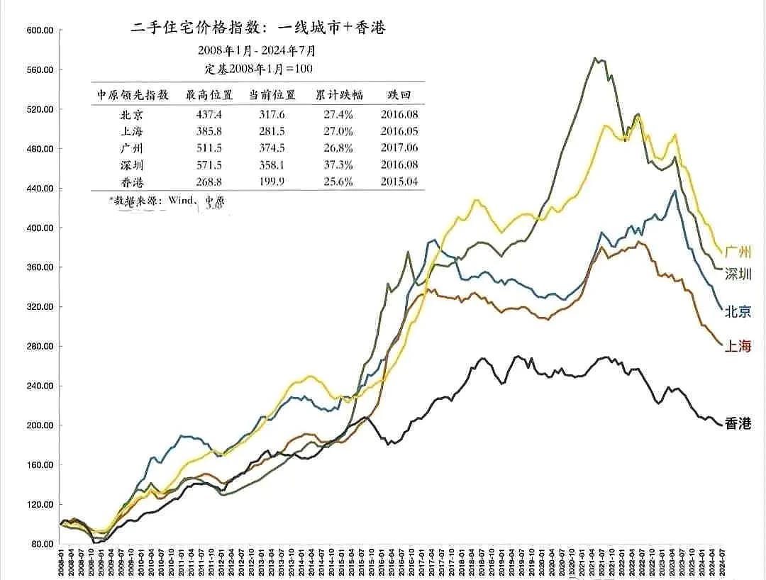 北京核心区,把2020~2022年间的涨幅跌没了,房价回到2019年。北京郊区呢,2020~2022年没怎么涨,跌也没拉下,直接跌回2016年了。北京这些年限购限贷最严,购杠杆率低,房地产市场是最健康的。这个基本说的对