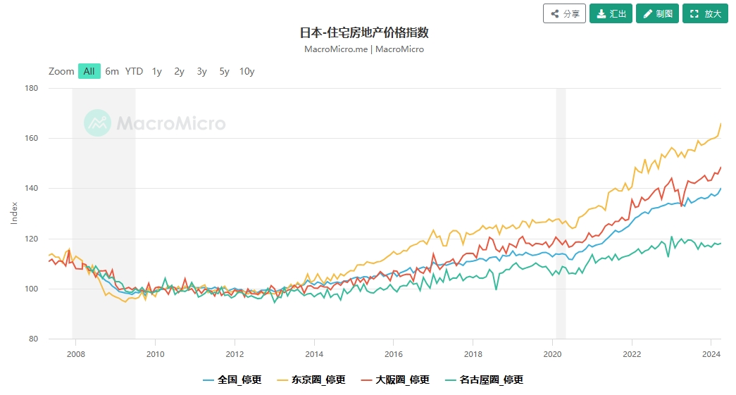 随便搜了两张图,第一张是2008年以来,日本东京、大阪、名古屋三大都市圈的不动产价格指数,很明显东京的上涨幅度最高,名古屋最差,甚至低于日本全国平均水平。原因嘛,当然是因为丰田江河日下喽。
