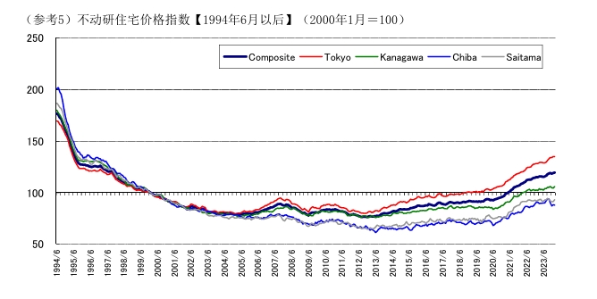 第二张是1994年泡沫破灭以来,具体到东京圈的不动产价格指数,红色的东京相较周边绿色的神奈川、蓝色的千葉、灰色的埼玉的跌幅最小,反弹幅度也最大。