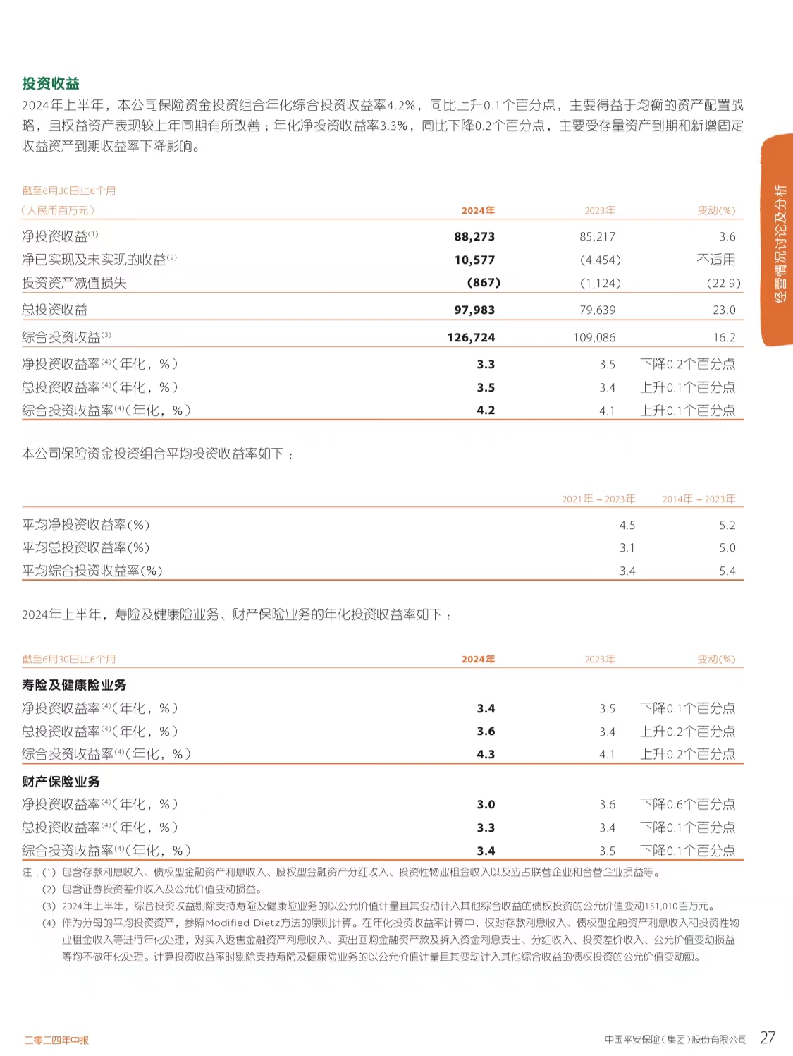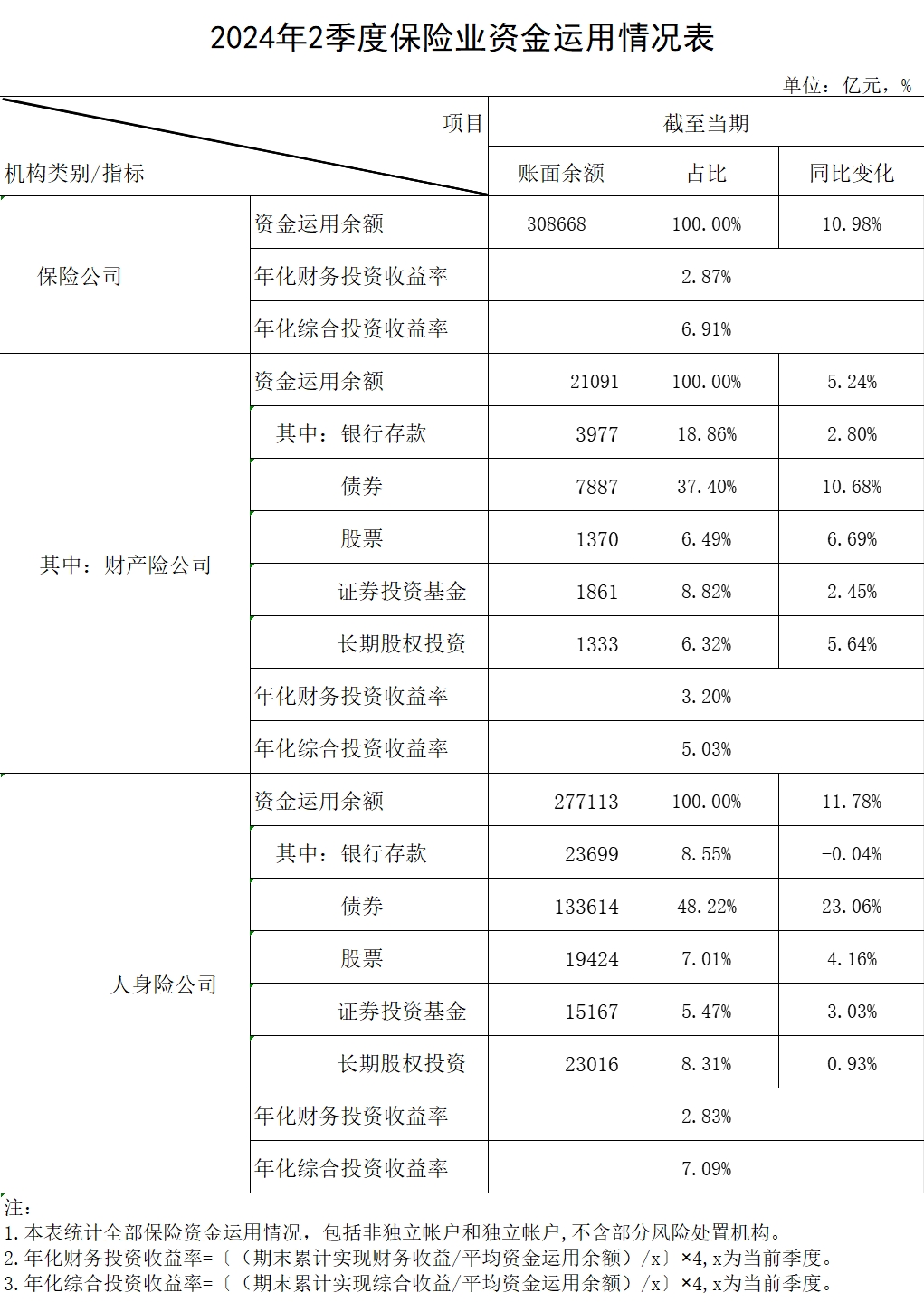 2024年6月末,中国人寿保险资金投资组合中股票4417.39亿元,占比 7.26%,较上年末减少0.69个百分点;基金2736.67亿元,占比 4.50%,较上年末增加0.68个百分点。基金含权益型基金、债券型基金和货币市场基金等,其中货币市场基金截至2024年6月末为10.73亿元。保险资金投资组合净投资收益率为3.03%,同比下降0.7个百分点。