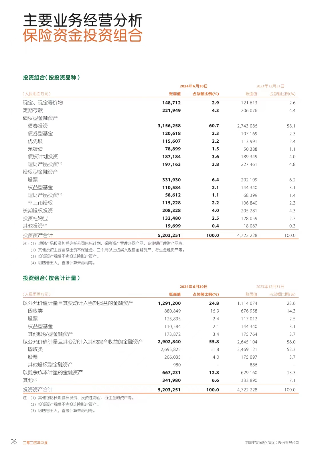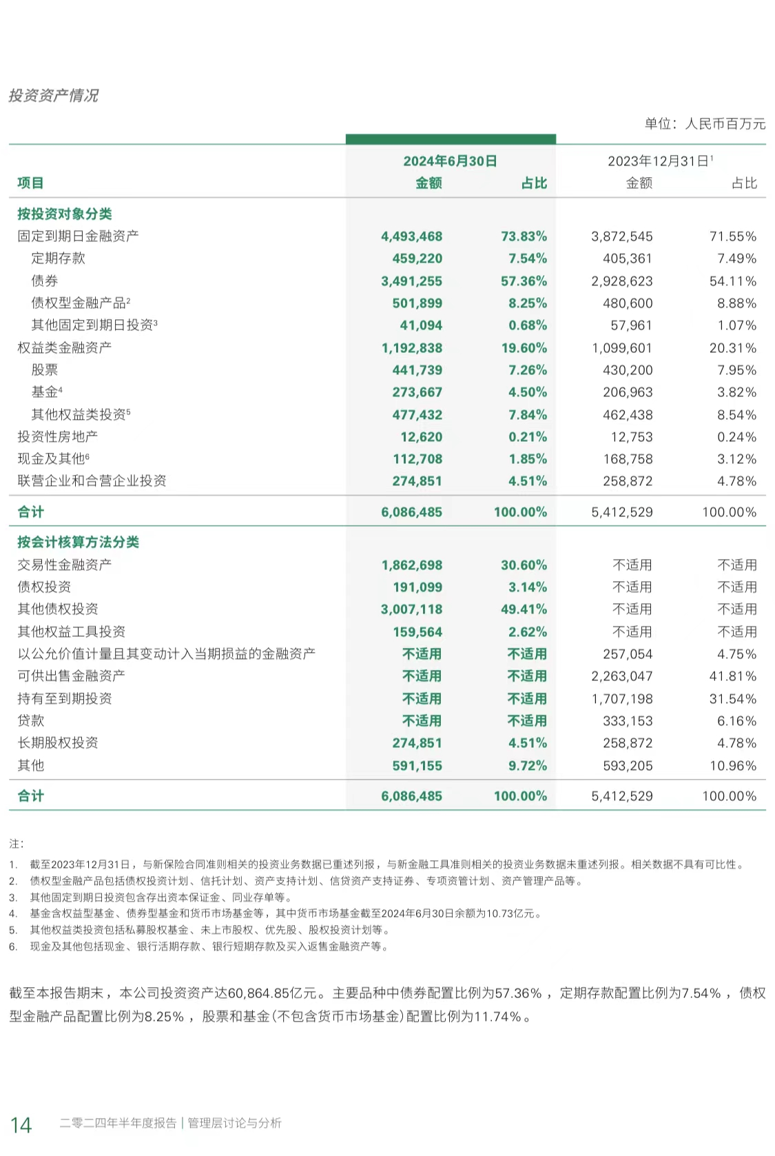 从各类资产具体构成来看,现金及流动性资产占比3.85%,较上年末下降0.44个百分点;银行存款占比6.98%,较上年末下降1.60个百分点;债券占比46.77%(包括利率债32.68%、信用债14.09%),较上年末上升4.33个百分点(其中利率债上升4.63个百分点、信用债下降0.30个百分点);股票占比7.36%,较上年末下降0.17个百分点;公募基金(不含货基)占比5.61%,较上年末上升0.29个百分点;组合类保险资产管理产品占比4.68%,较上年末下降0.36个百分点;债权投资计划占比5.40%,较上年末下降0.09个百分点;信托计划占比4.72%,较上年末下降0.78个百分点;股权投资占比6.75%,较上年末下降1.08个百分点;投资性房地产、境外投资占比分别为2.14%、1.87%,分别较上年末上升0.18个百分点、下降0.12个百分点。