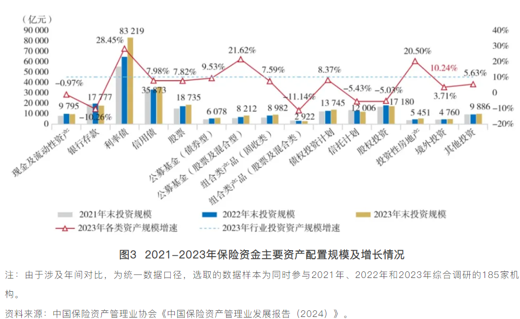 2023年,除银行存款、股权投资、信托计划、组合类产品(股票及混合类)和现金及流动性资产规模下降,其余各类主要资产的投资规模均有不同程度的增长。其中,投资规模增速前三的资产为利率债(28.45%)、公募基金(股票及混合型)(21.62%)、投资性房地产(20.50%);投资规模下降较快的资产为组合类产品(股票及混合类)、银行存款、信托计划、股权投资,投资规模分别下降11.14%、10.26%、5.43%、5.03%。