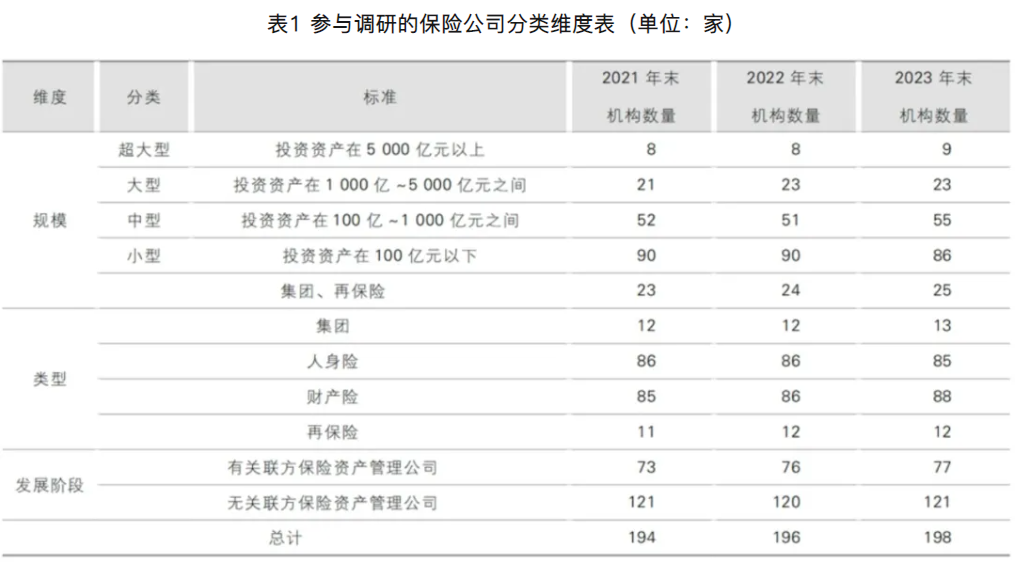 截至2023年末,我国共有205家保险集团(控股)公司和保险公司(以下统称保险公司),保险业总资产为29.96万亿元,同比增长10.4%;保险资金运用余额为28.16万亿元,同比增长11.05%。参与本次调研的保险公司共有198家,涉及投资资产规模合计26.12万亿元。从机构类型看,包括保险集团13家、人身险公司85家、财产险公司88家、再保险公司12家。从投资资产规模看,包括超大型公司(≥5000亿元)9家、大型公司(1000-5000亿元之间)23家、中型公司(100-1000亿元之间)55家、小型公司(≤100亿元)86家,以及保险集团公司和再保险公司25家。