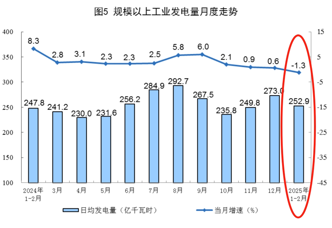 1—2月份,规上工业发电量14921亿千瓦时,同比下降1.3%;日均发电252.9亿千瓦时,同比增长0.4%。