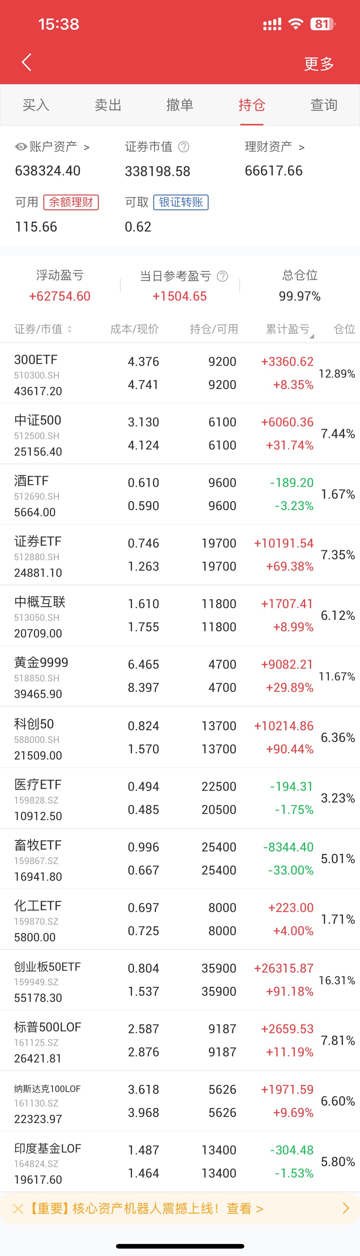 根据产品合同所明示的投资范围和投资比例,对不同类型基金产品的风险等级划分基准为:按照低中高三个等级,根据自身风险承受能力,将比例划分为3:5:2比较适宜。因休市期间,银河证券无法正常显示场外基金持仓,大概算了下,目前证券市值46.5万,资金合计47.3万。证券:资金基本为1:1,对照看了下自己的配置,将证券持仓下的各种宽基指数基金、行业指数基金归为中等风险,资金持仓的货币基金、国债逆回购归为低风险,也就是低等级超配、中风险正好、高风险缺失。问题是高风险对应的股指期货、股权信托也玩不转啊。。。