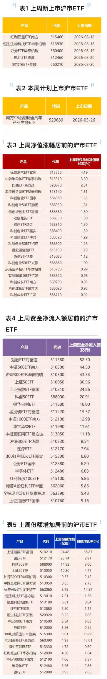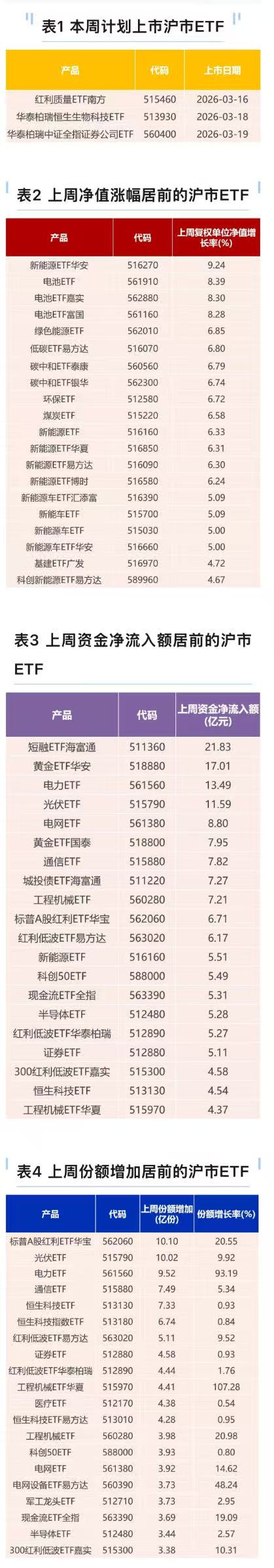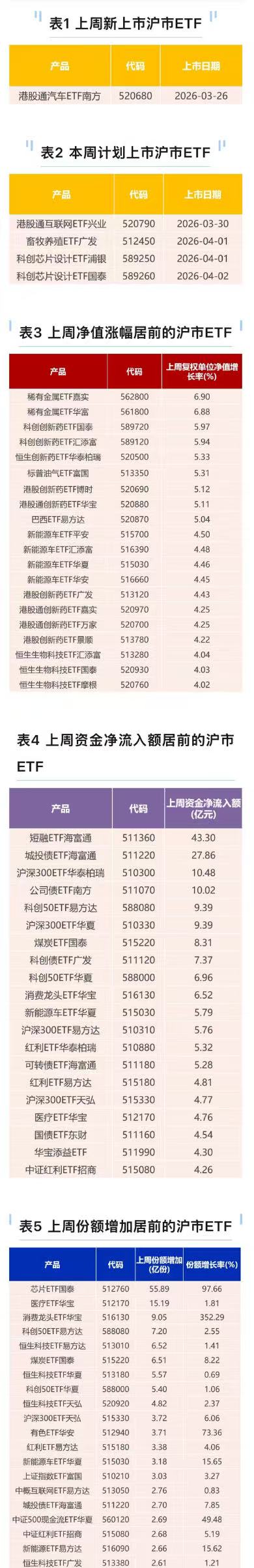 截至上一周末(2026年1月23日),上交所ETF市场共计挂牌811只ETF产品,上周新上市ETF产品3只,本周计划上市ETF产品4只。
