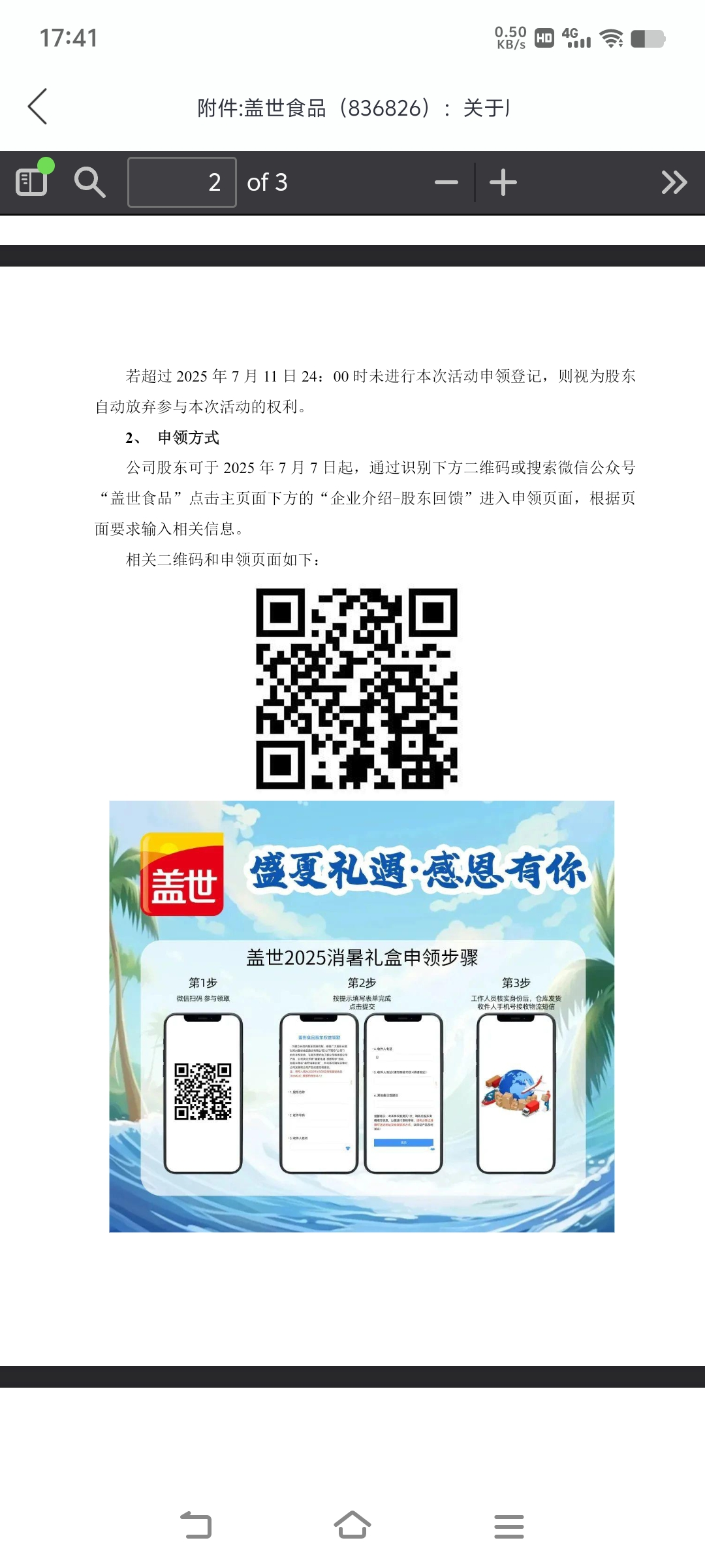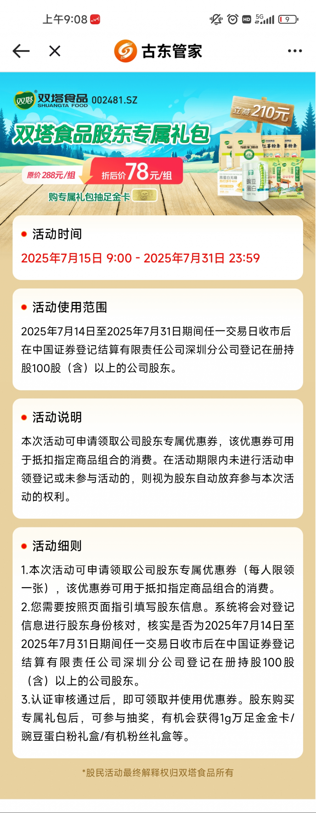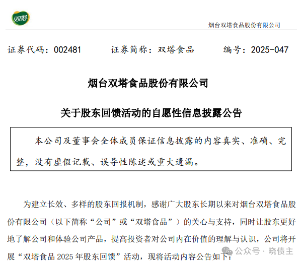 提醒非常及时,埋伏大成功。盖世食品:关于股东回馈活动的自愿性信息披露公告http://static.cninfo.com.cn/finalpage/2025-07-04/1224083714.PDF三、 参与活动的股东范围截至 2025 年 6 月 30 日(公司 2024 年年度权益分派股权登记日)下午收市在中国证券登记结算有限责任公司北京分公司登记在册的持有公司股份的股东,均可参与此次活动。