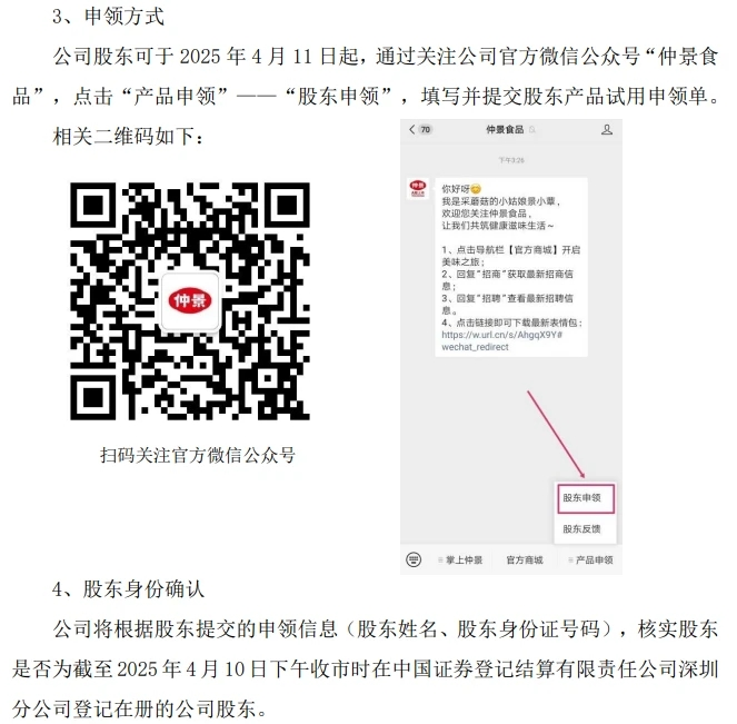 如何领取:通过公司官方网站或官方微信公众号“仲景食品”进行申领。