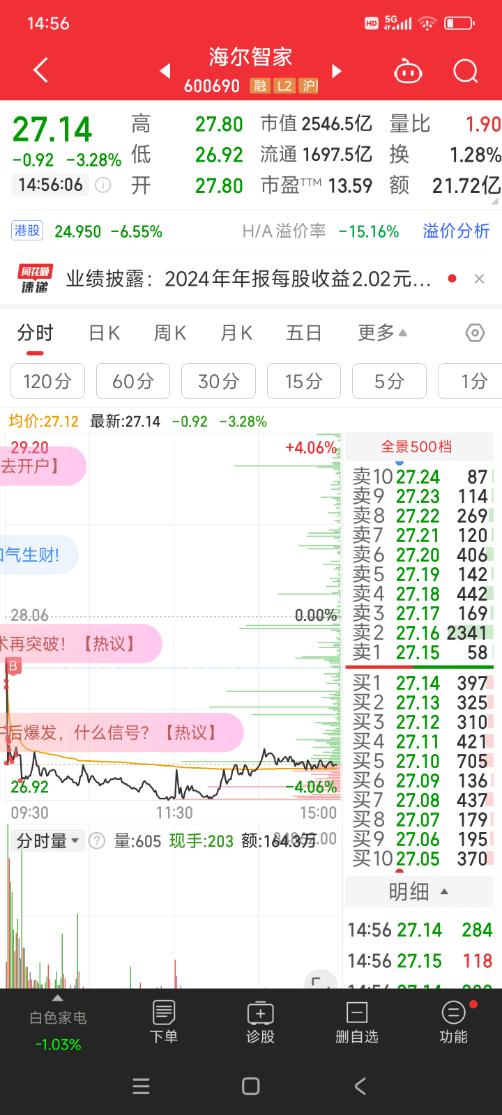 今天海尔回落,估值接近格力,移3成仓到海尔。