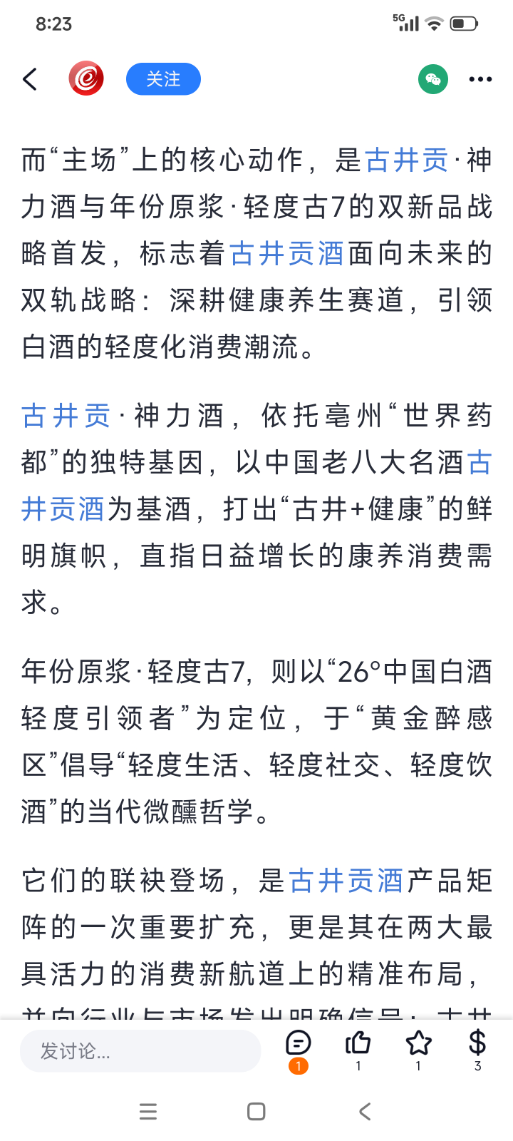 古井贡净资产高十几元,而且盘子小,溢价应该也高二三十元,现在价格竟然基本一样了!继续持有古井贡,五年后净资产会推高到近80元左右,分红也有每股30元左右,每年利用分红还部分融资,部分铺设网格。忘掉暂时的亏损,最少持仓三年,目光放到5年后,10年后,只要白酒企业还能稳定挣钱,随着每年稳定的分红,净资产每年稳定增长,相信白酒一线和二线龙头早晚股价会起来。