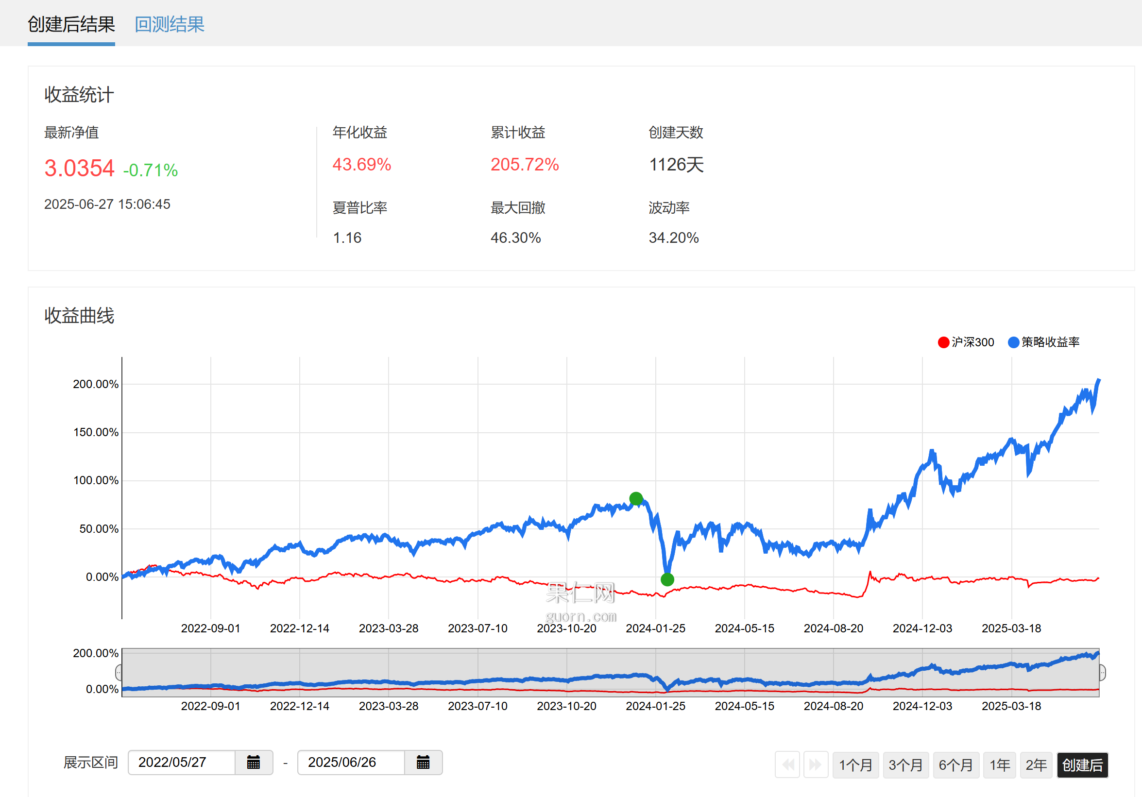 看了下三年前果仁创建的小市值策略,2022年5月创建的策略,到现在创建后三年三倍