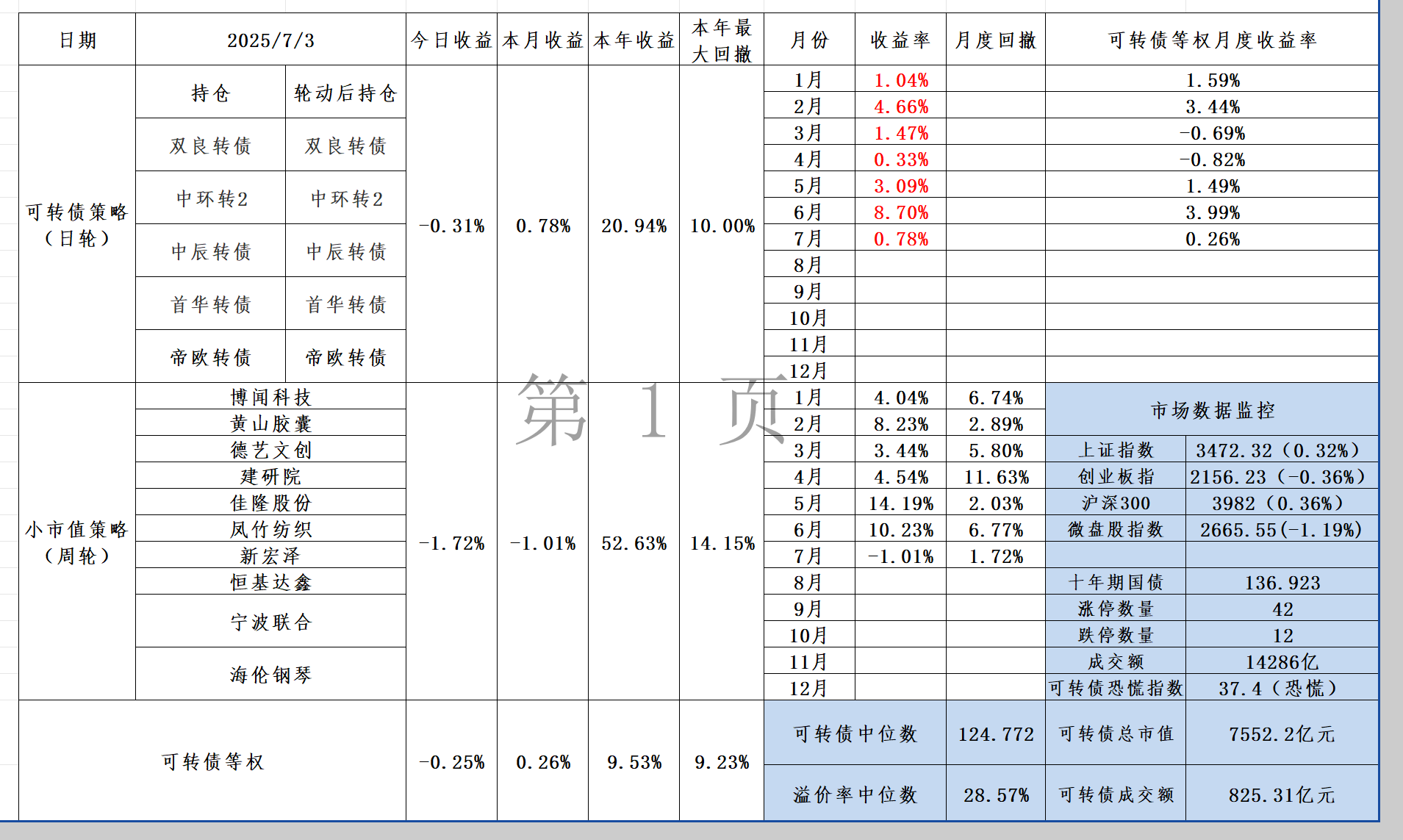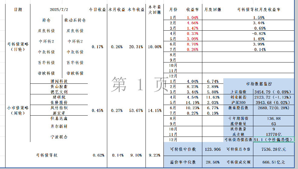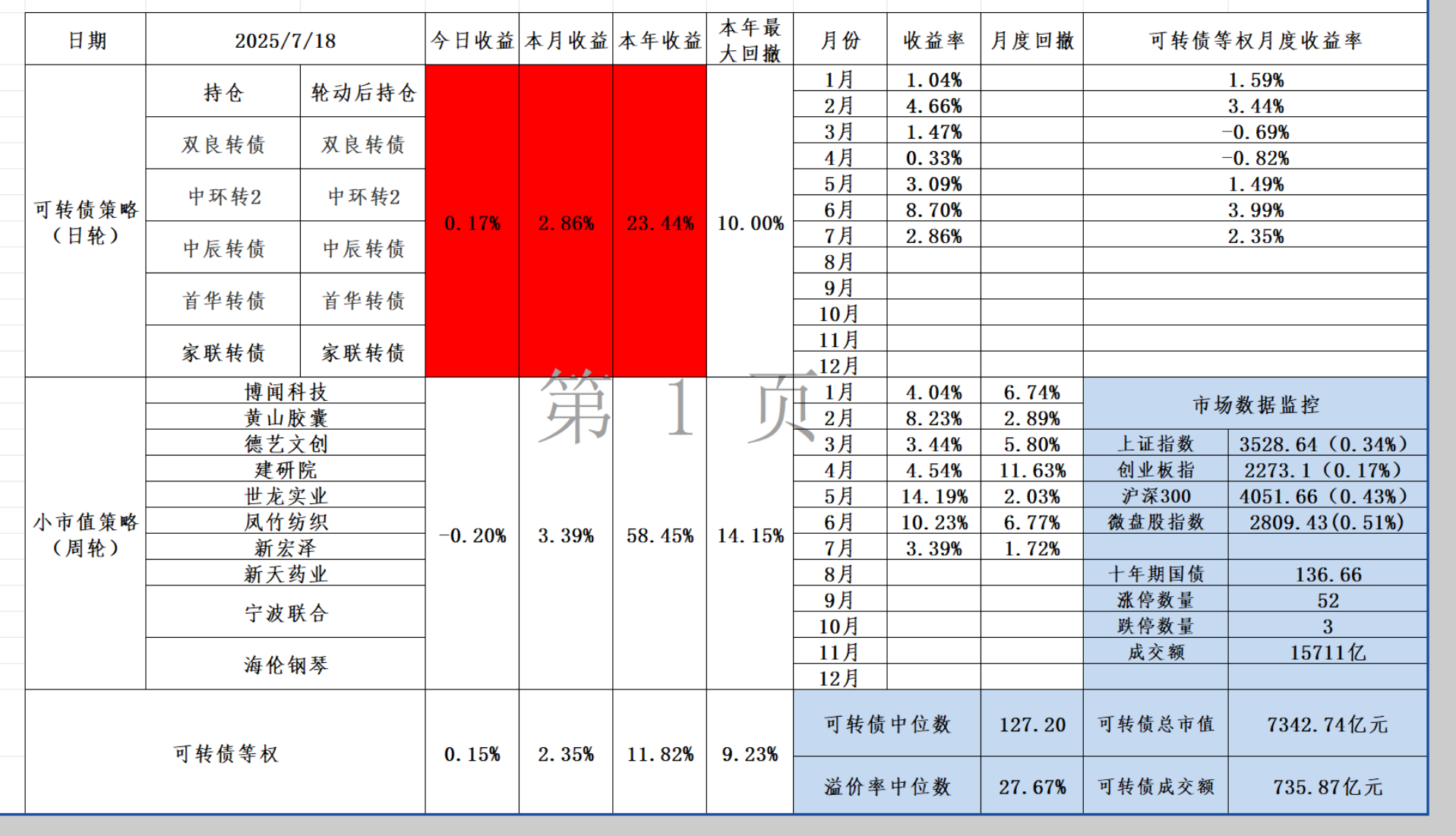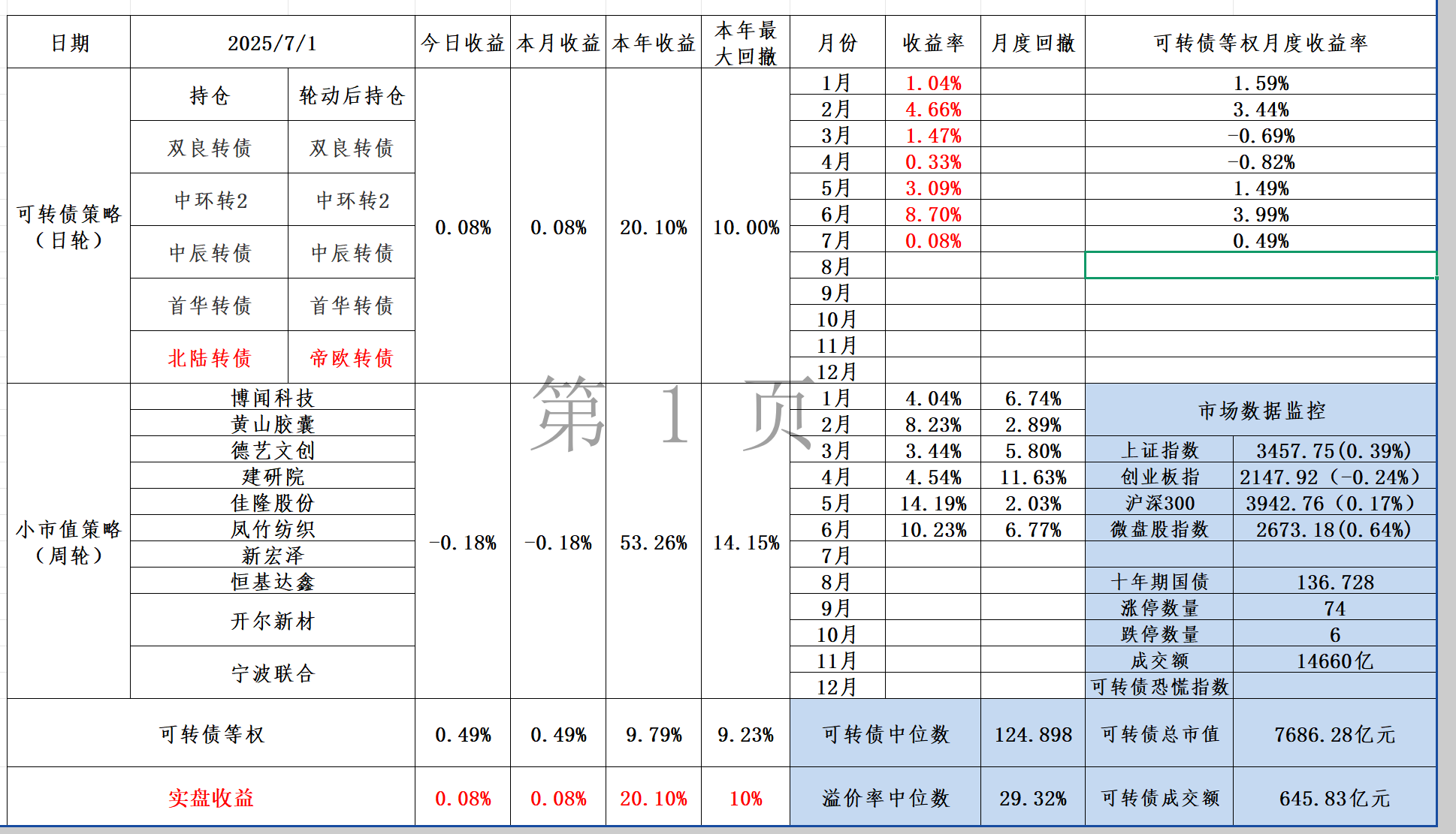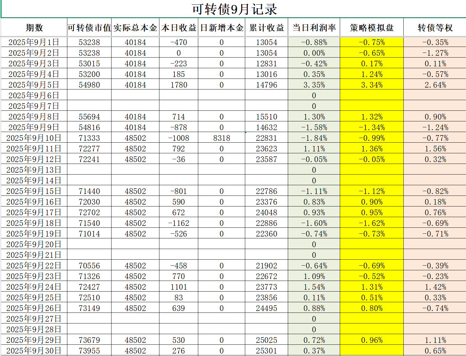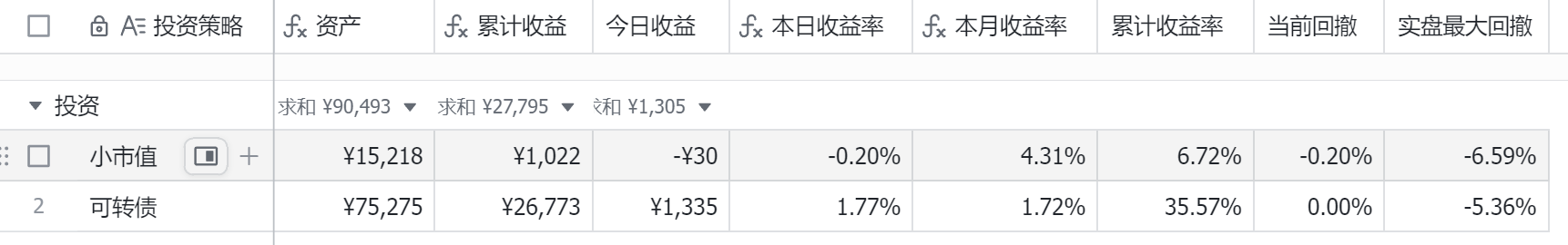 本月收益率4.6%,其中可转债3.74%(可转债等权2.2%),小市值6.06%。目前资产85932元,本年收益率39.83%。
